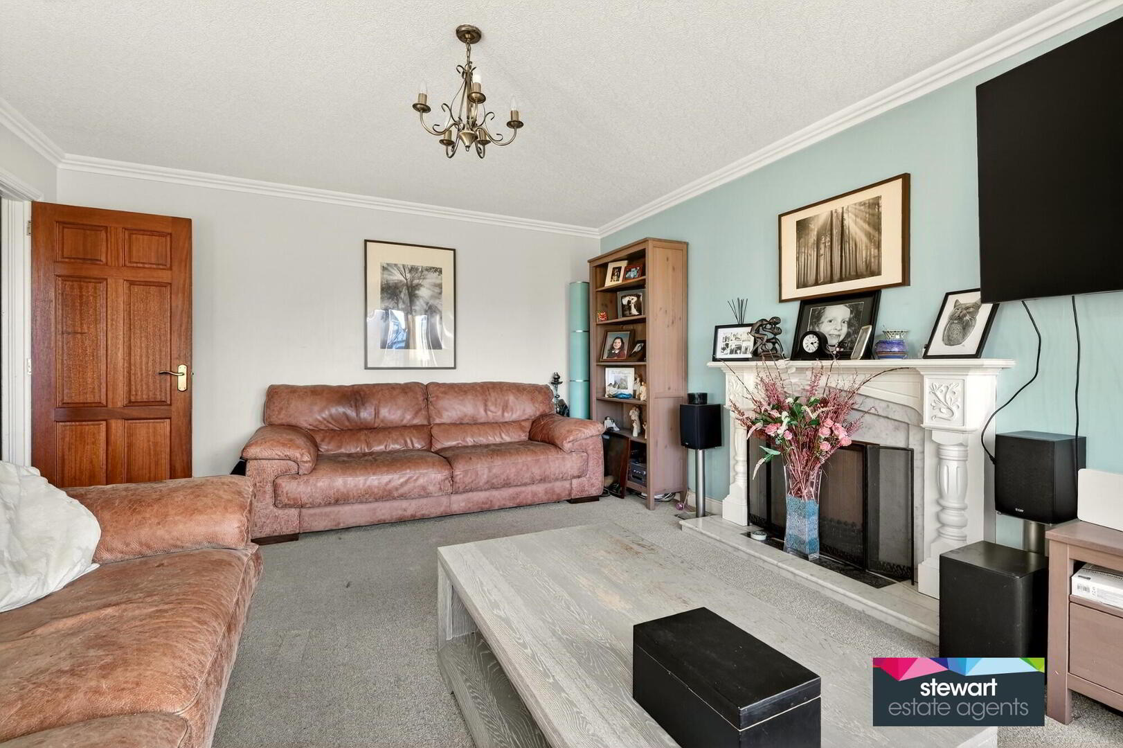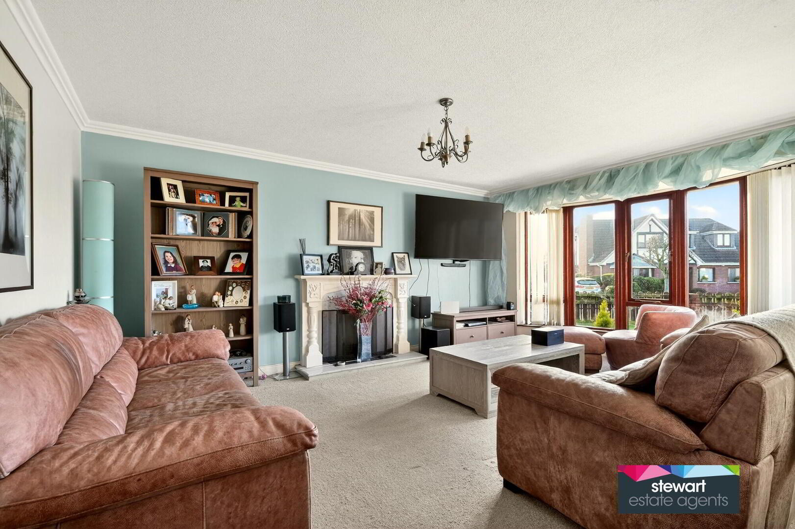 Living room with a feature fireplace including a marble inset and open fire. Bow window