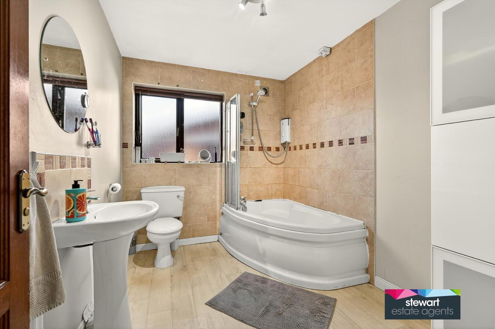 Downstairs bathroom with a modern style white suite including a corner style bath with shower fitment above, WC and wash hand basin. Partially tiled walls