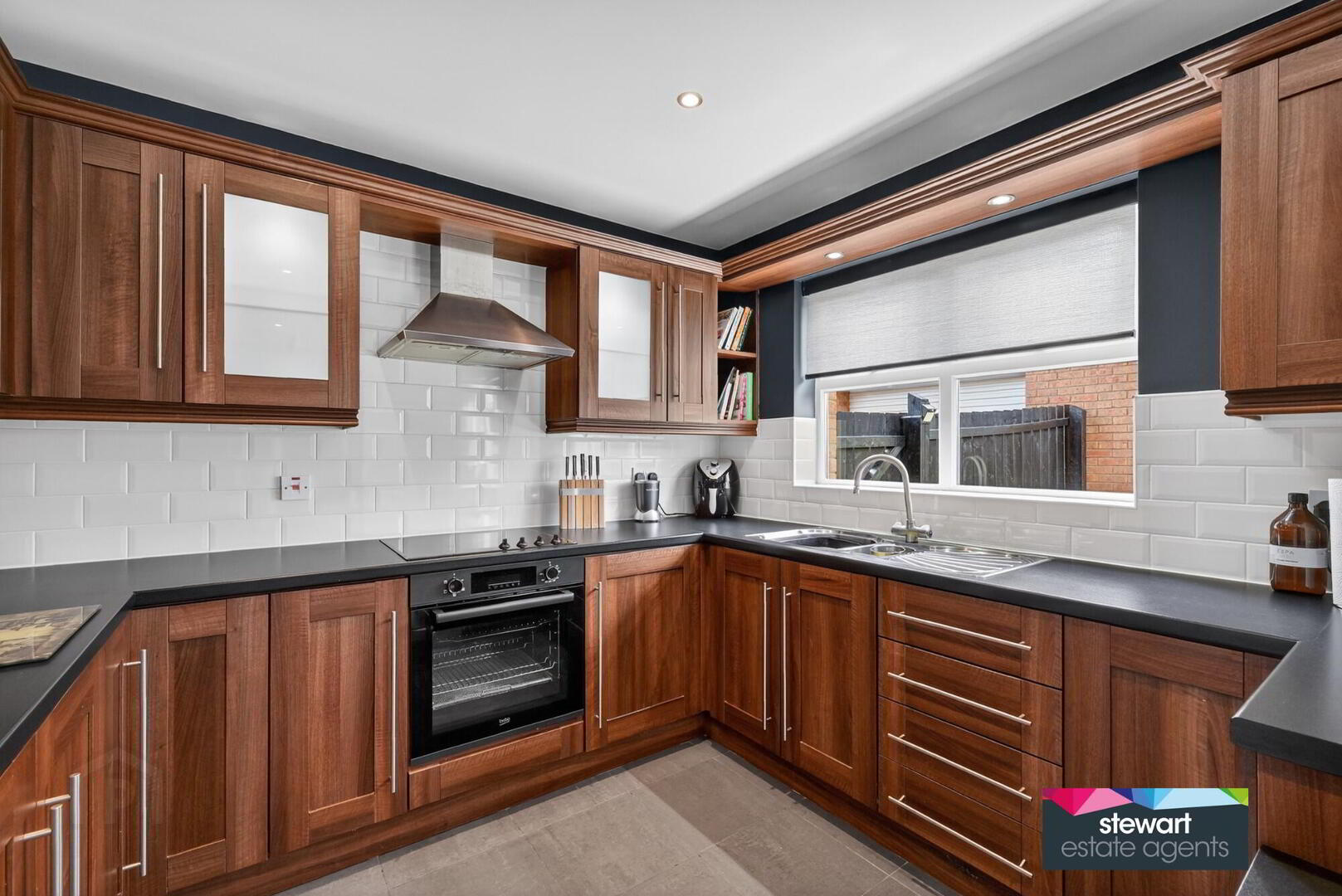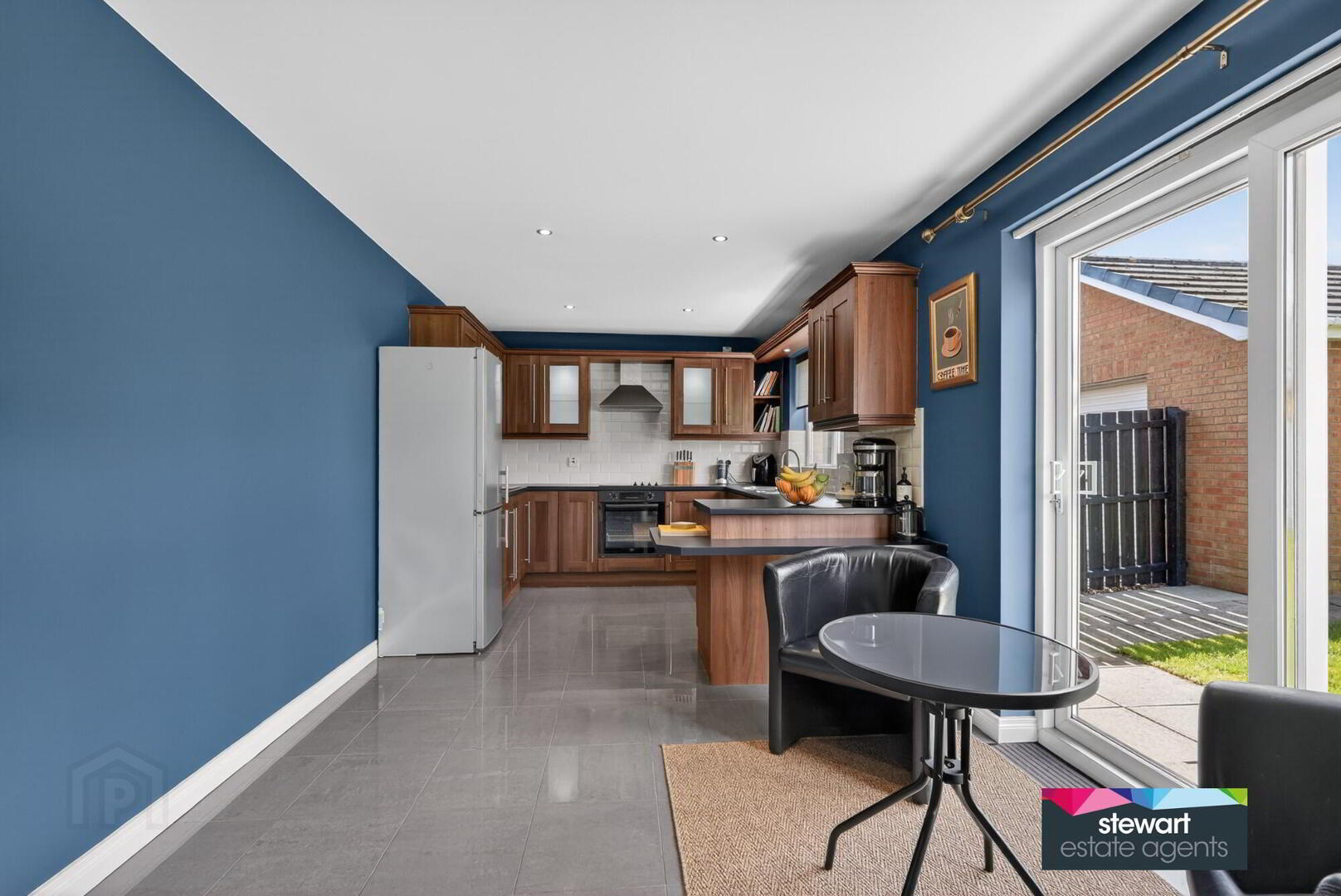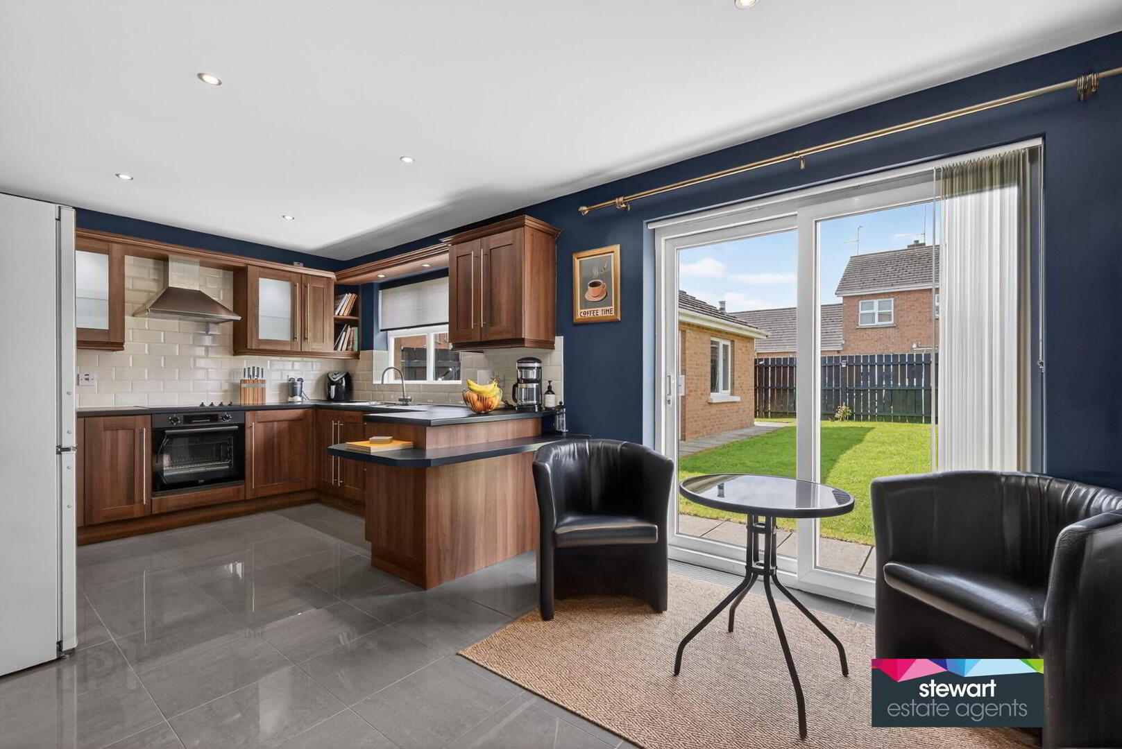 Open plan kitchen with dining area having a contemporary style kitchen cabinetry including a built in oven and inset hob with extractor fan above. Breakfast bar. Partially tiled walls. Sliding patio doors to the rear garden