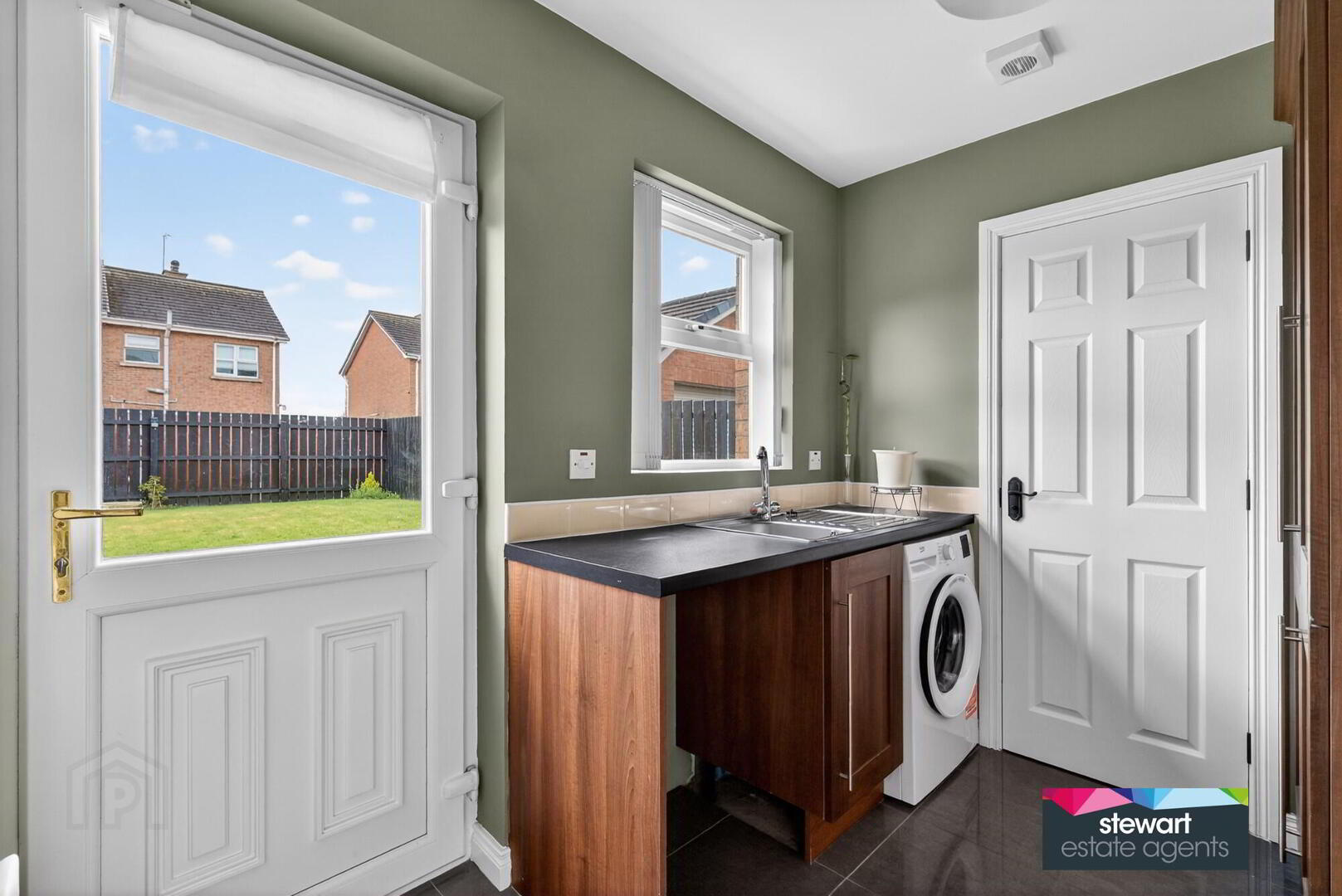 Separate utility room with fitted units including a space for an automatic washing machine and a space for a tumble dryer. PVC double glazed rear door to the garden