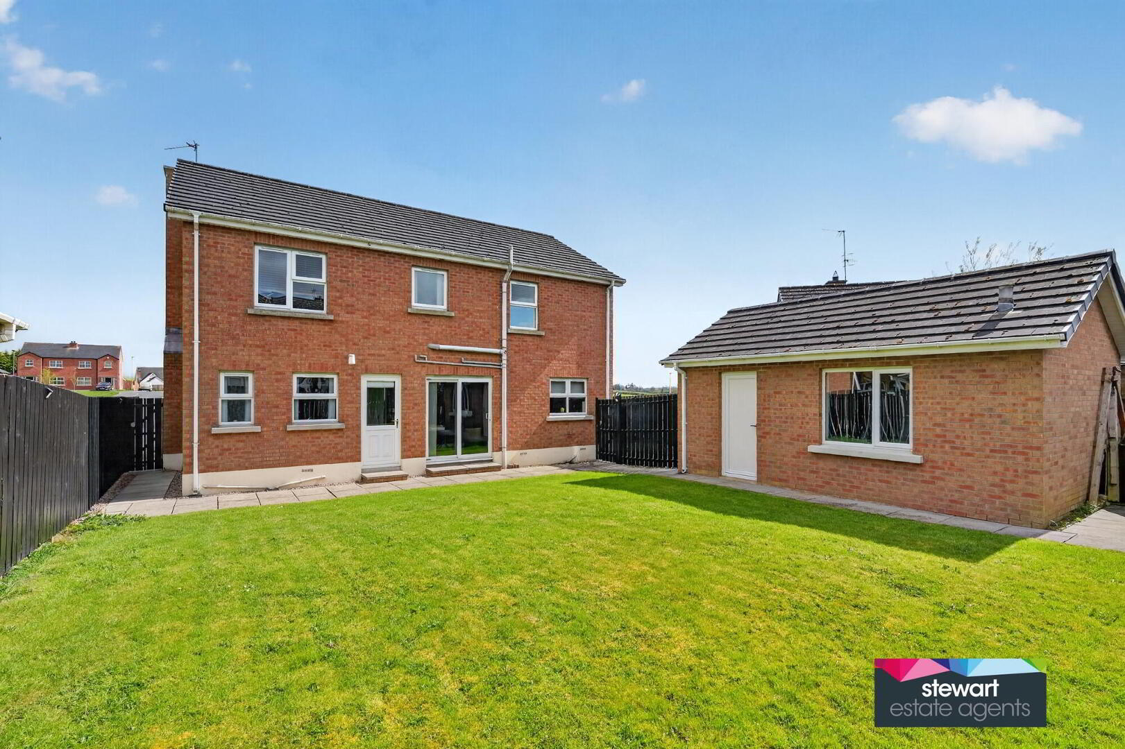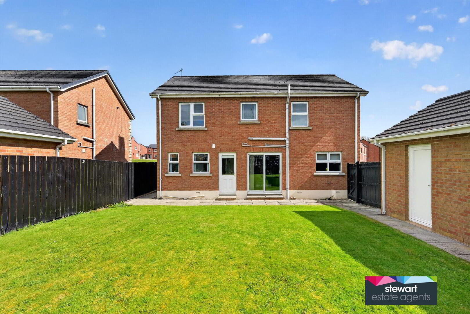Neat gardens front and rear laid out in lawns