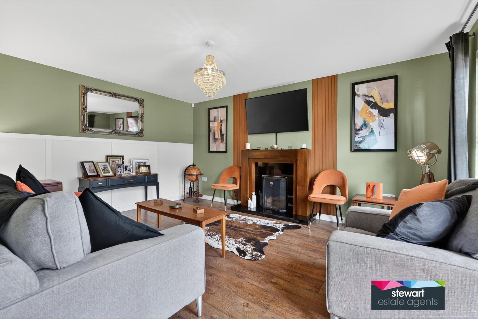 Living room with a contemporary style fireplace and an open fire. Feature panelled wall