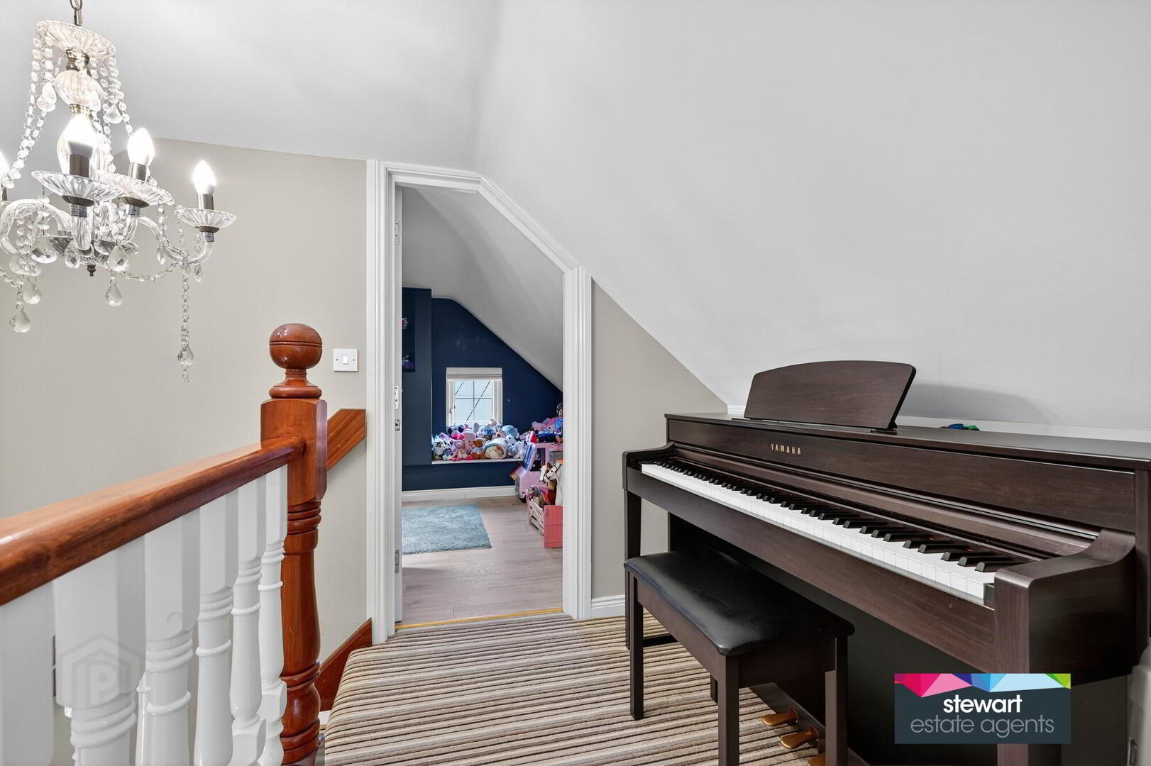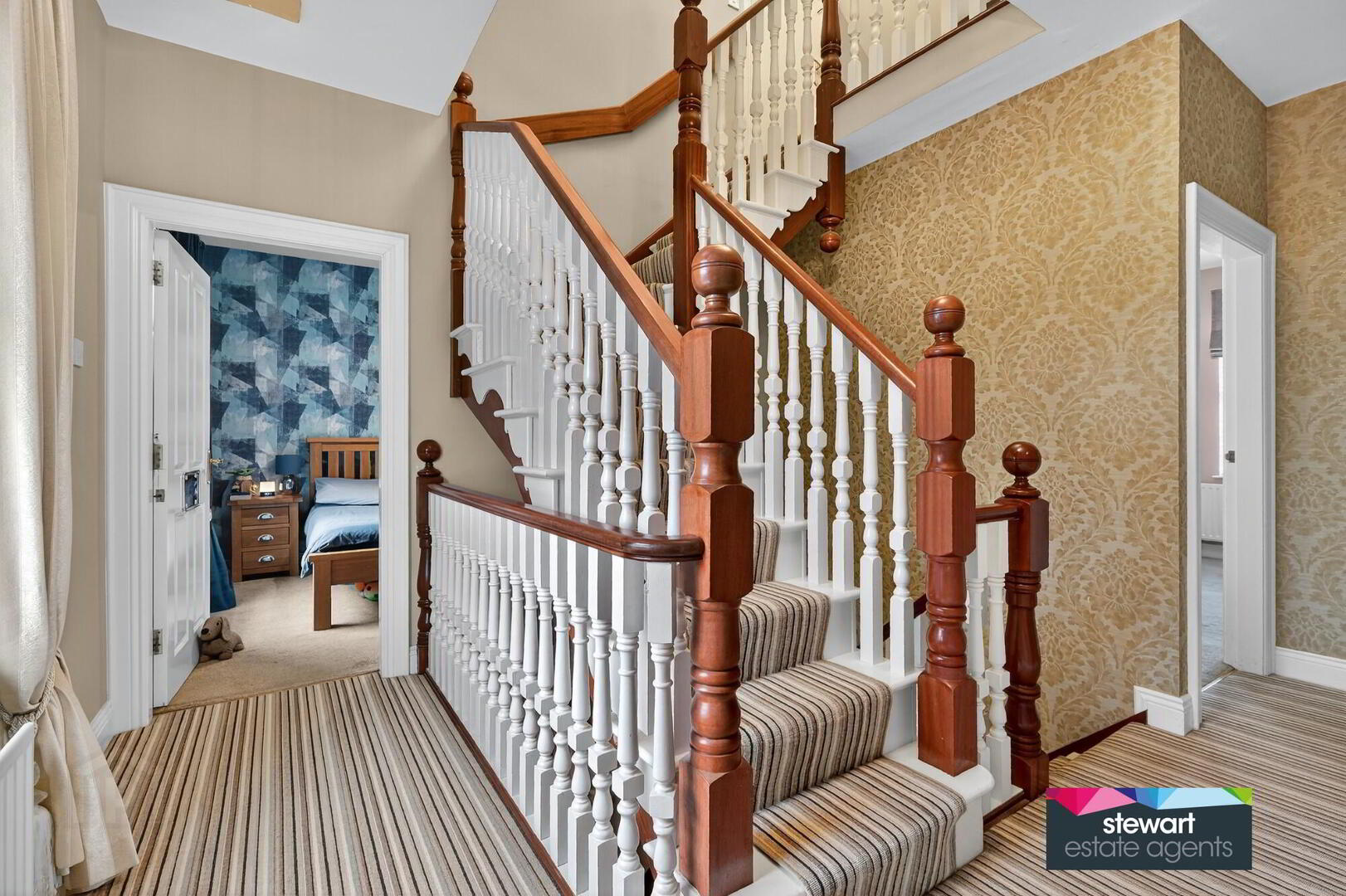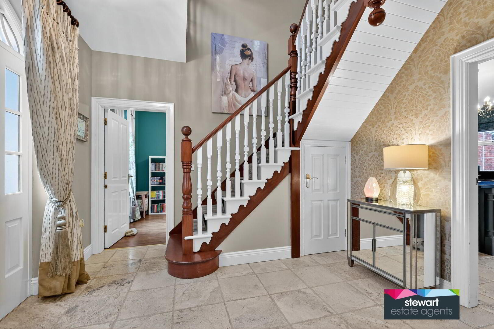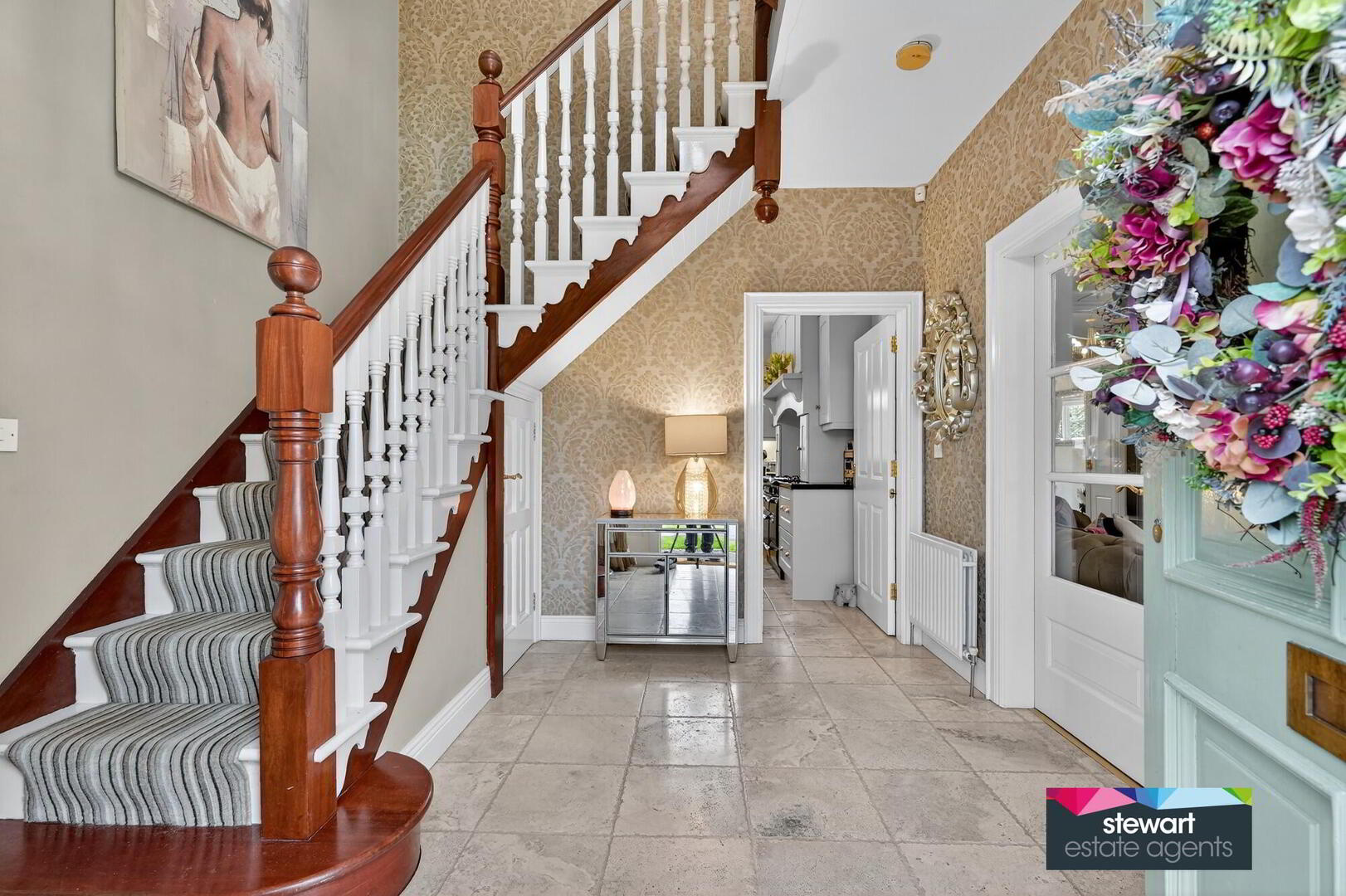 Central hallway with a traditional style front door and feature fan light above. Bespoke spindled staircase to the first and second floor accommodation