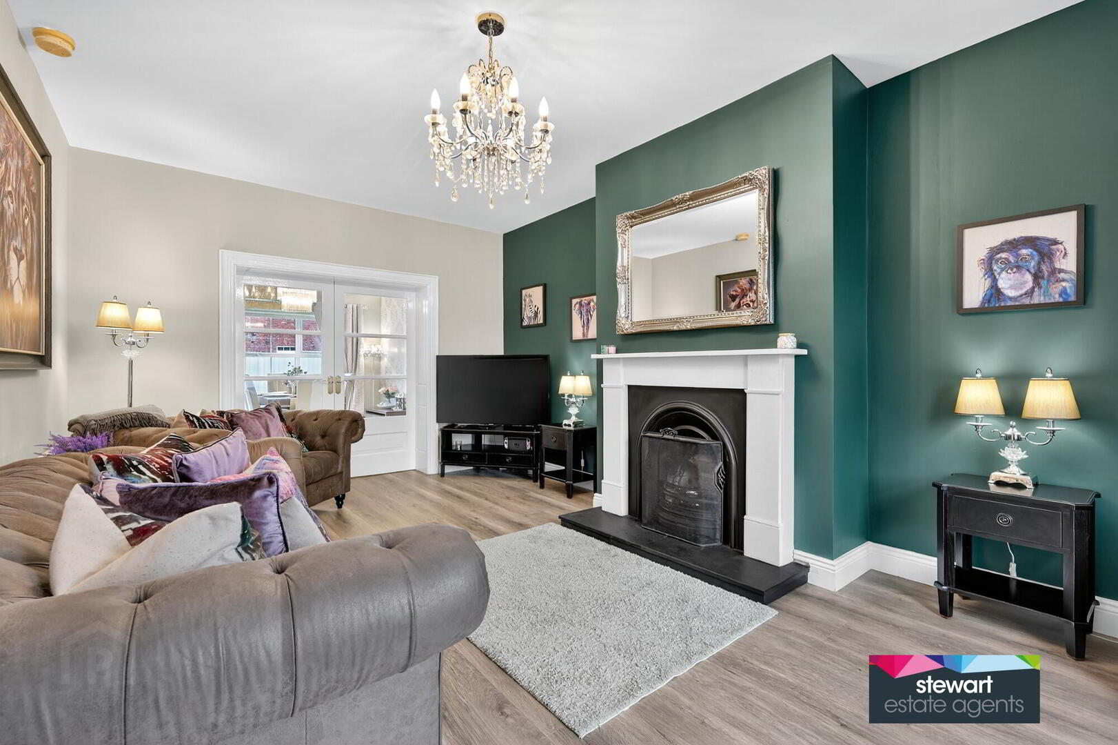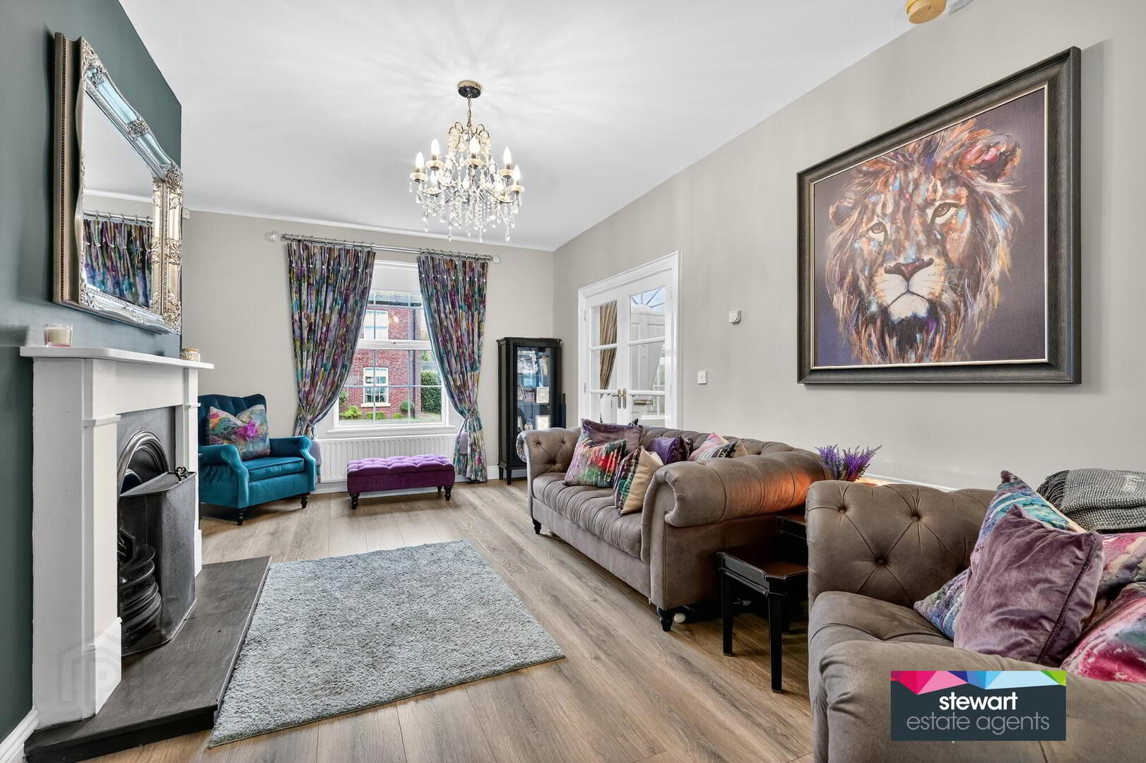 Elegant living room with a feature fireplace and an antique style inset. 2 set of matching glazed double doors