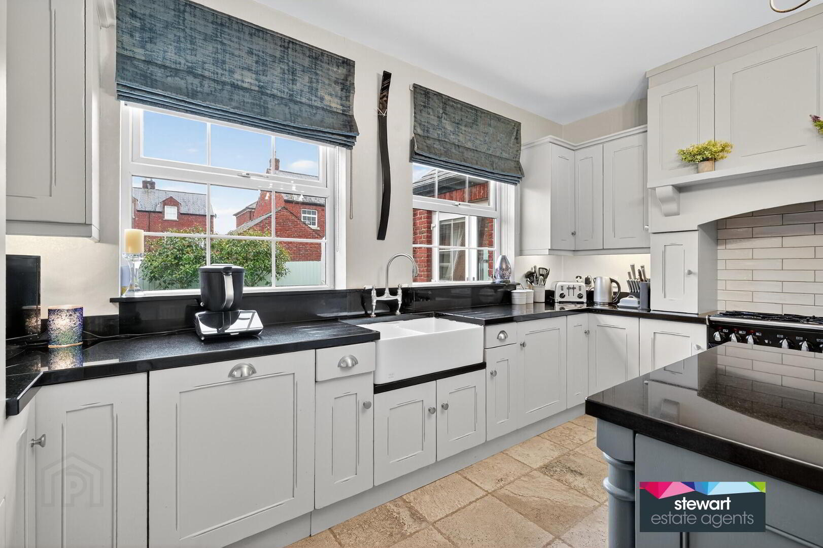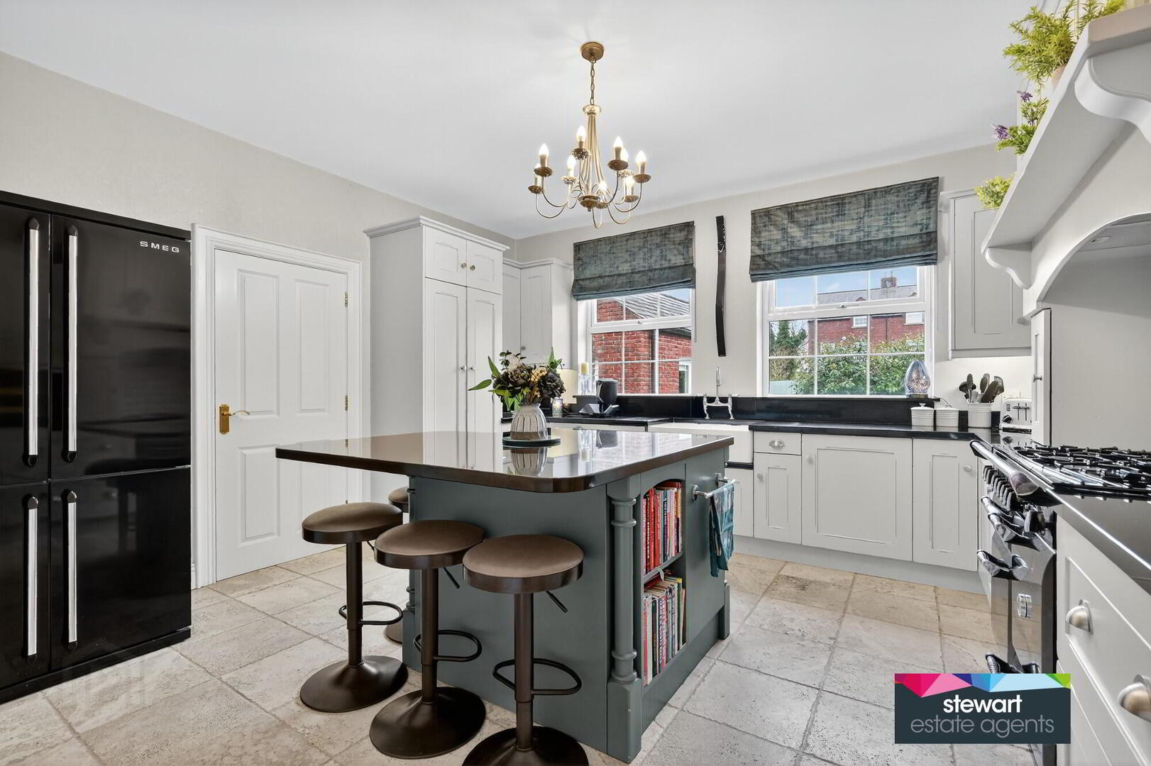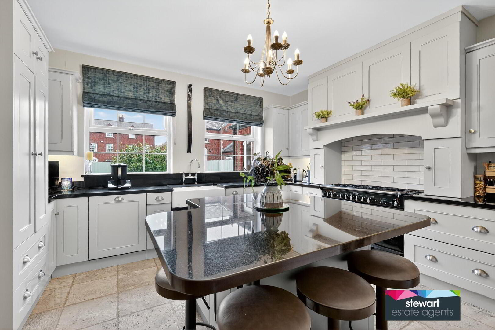 Attractive kitchen with beautifully fitted high and low level cabinetry including a feature island unit with granite work surfaces. Feature cooking area with space for a free standing range style cooker and a traditional style over mantle with an integrated extractor fan. Double porcelain sink unit. Integrated dish washer. Built in larder cupboard