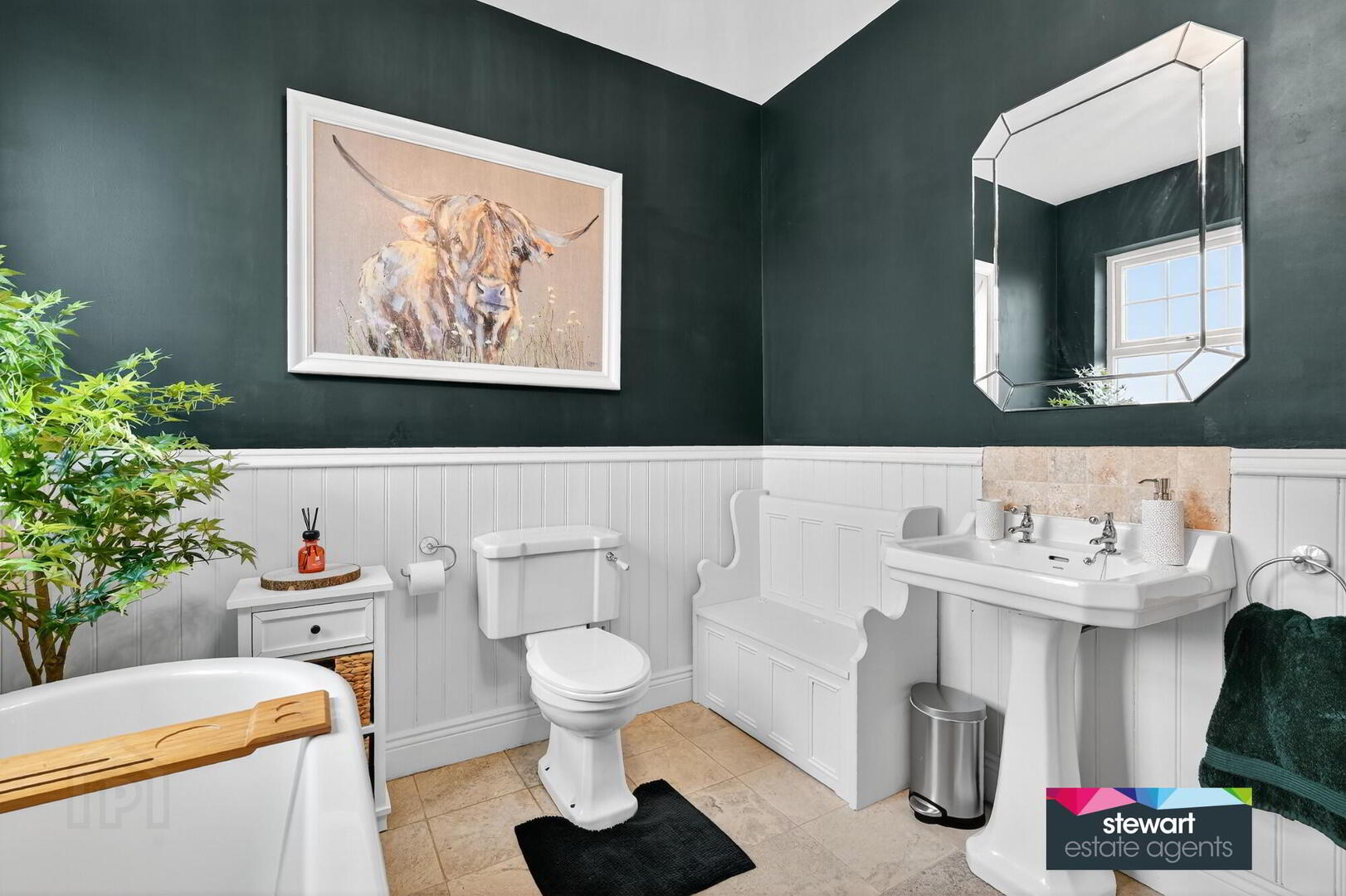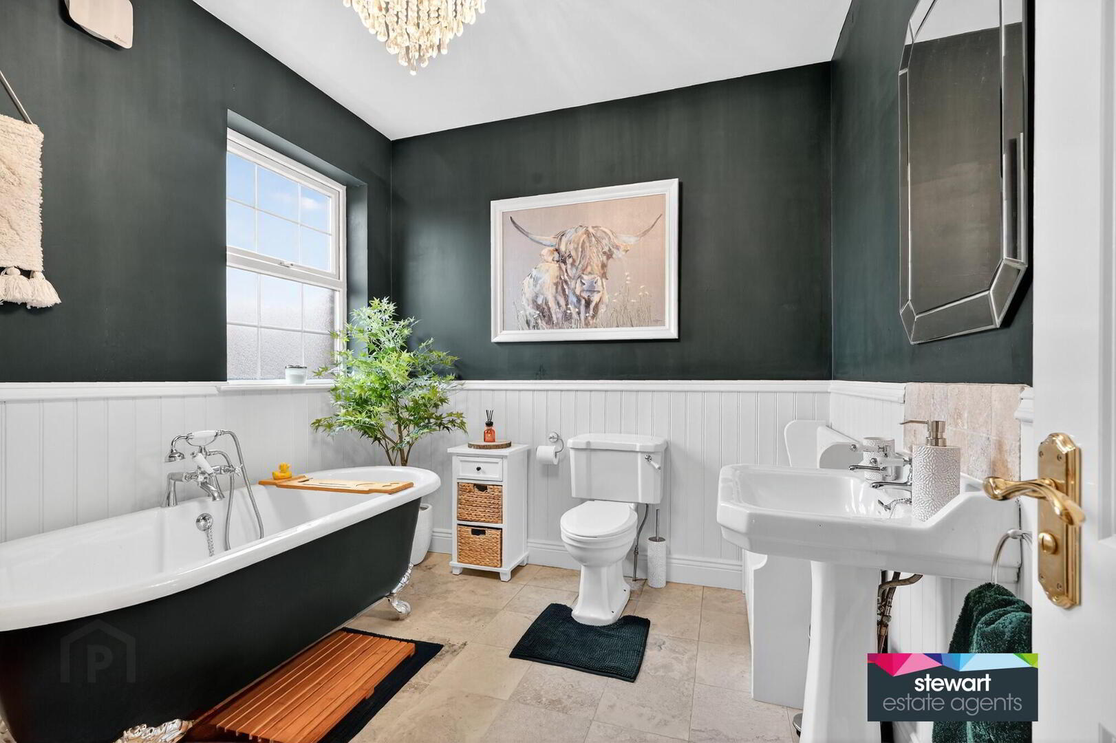 Bathroom on the first floor with a traditional style suite including a free standing traditional style bath, WC and wash hand basin. Low level wainscoting. Tiled floor
