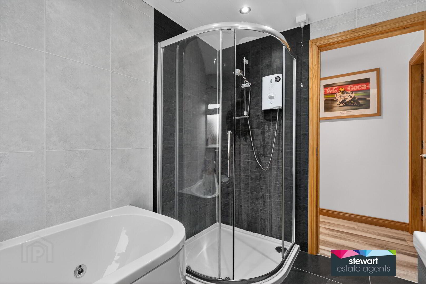 Bathroom with a beautifully designed modern suite including a jacuzzi style bath, WC and vanity wash hand basin. Separate shower cubicle with shower fitment. Feature tiles and wall mounted towel heater