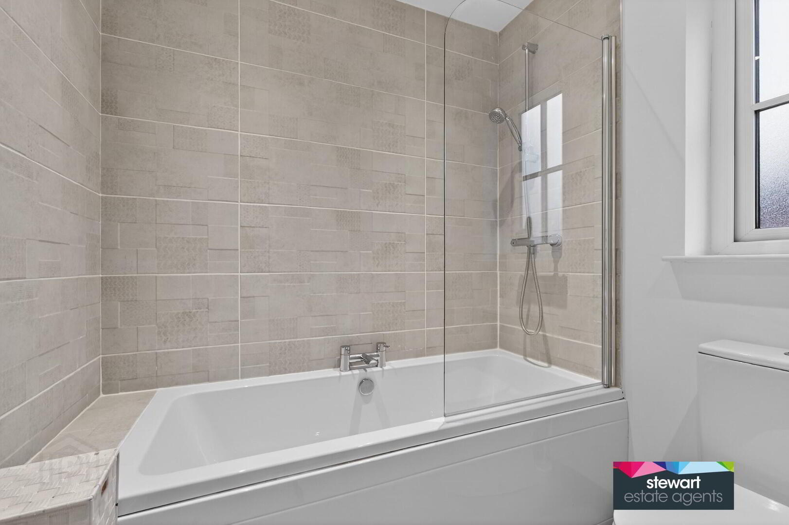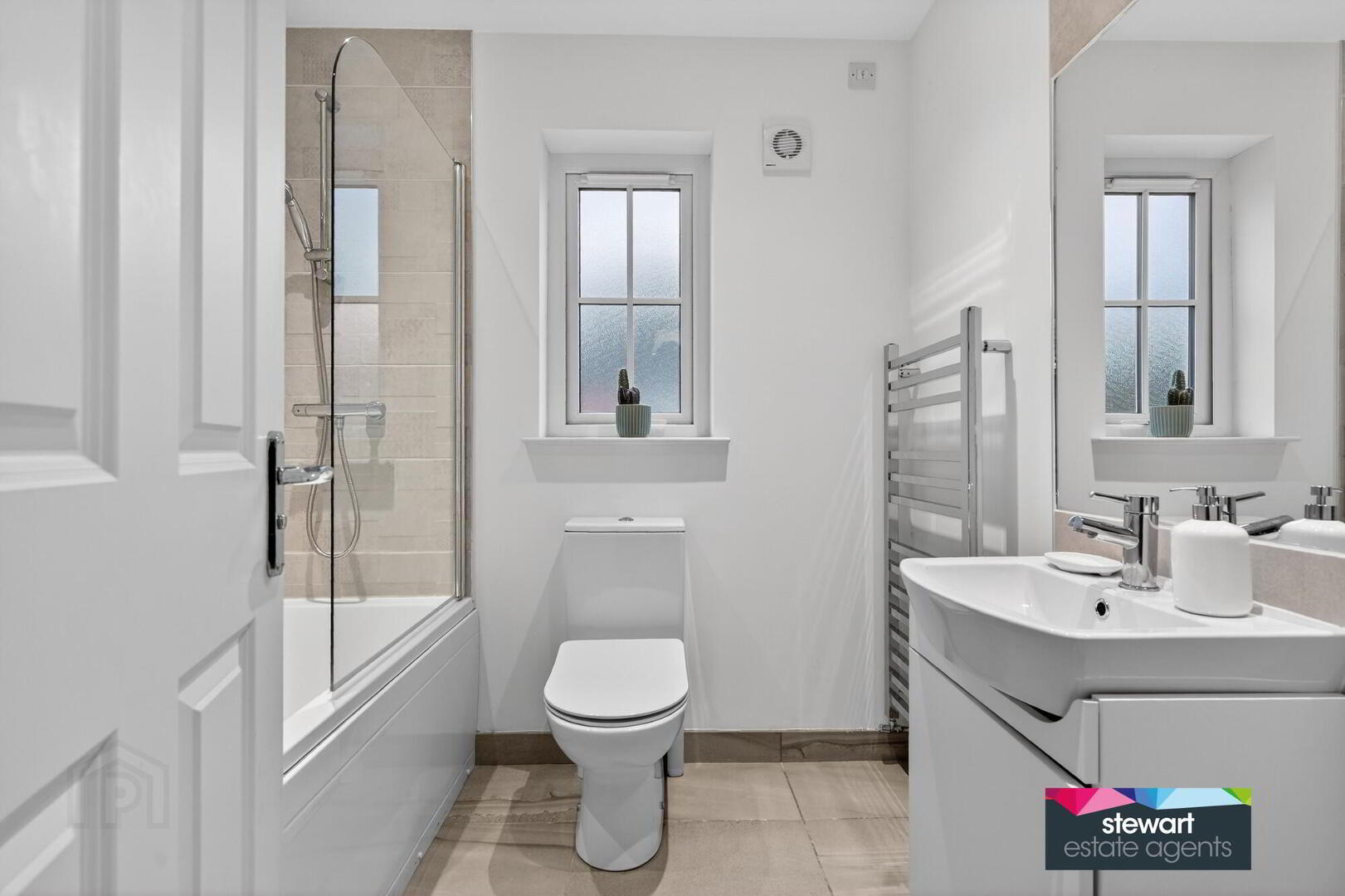 Bathroom on the first floor with a modern white suite including a bath WC and wash hand basin. Shower fitment and glass shower screen over bath. Heated towel rail