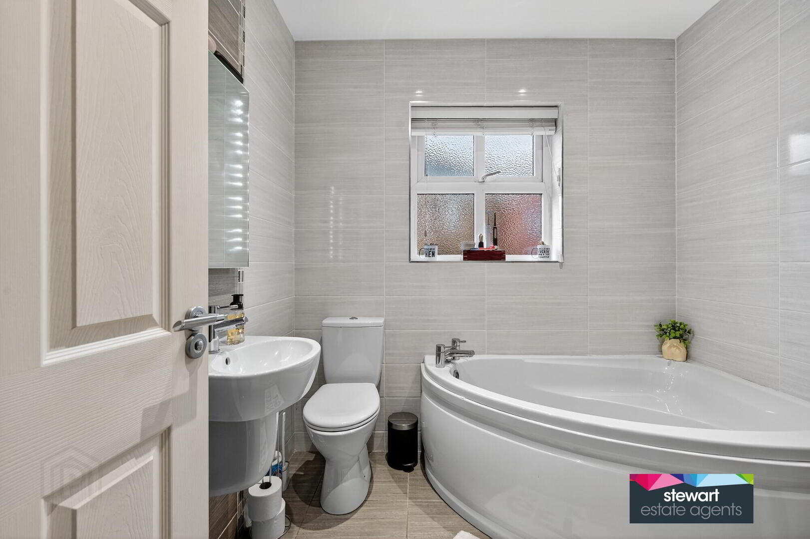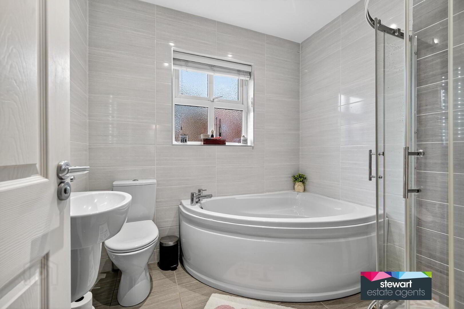 Bathroom on the first floor with a modern white suite including a corner panelled bath, WC and wash hand basin as well as a separate shower cubicle. Fully tiled walls