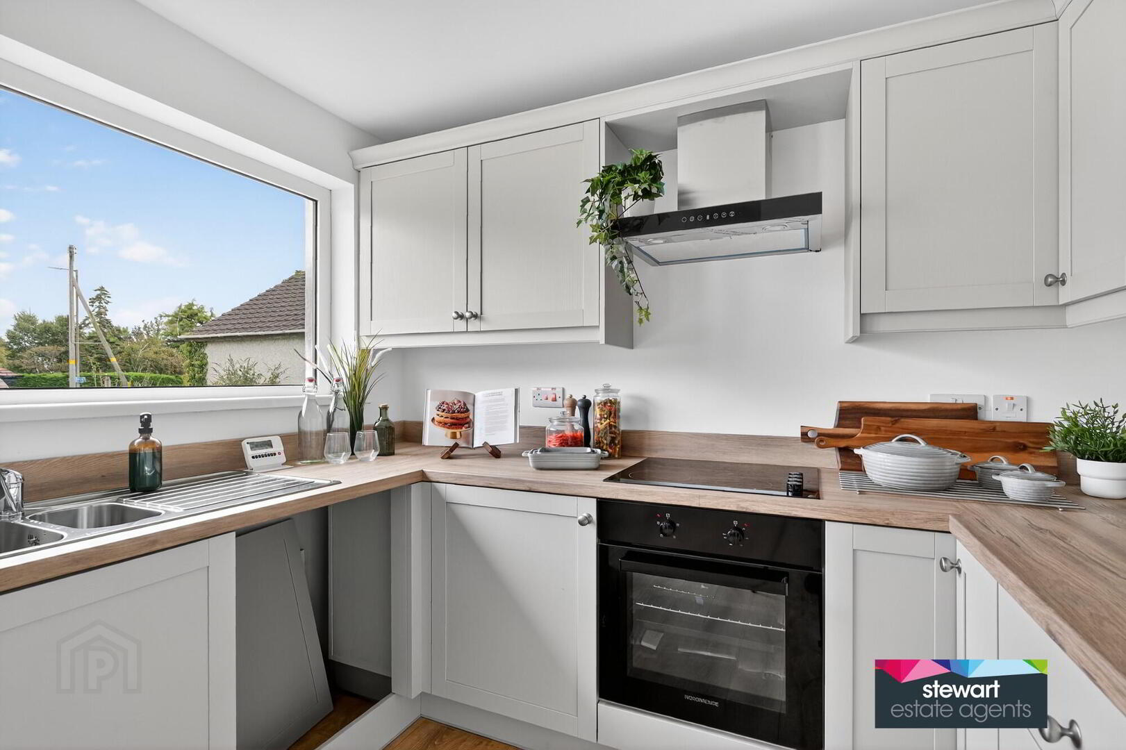 Open plan kitchen with dining room, having a contemporary style cabinetry with ample high and low level units. Space for integrated appliances. Built in oven and inset hob with extractor fan above