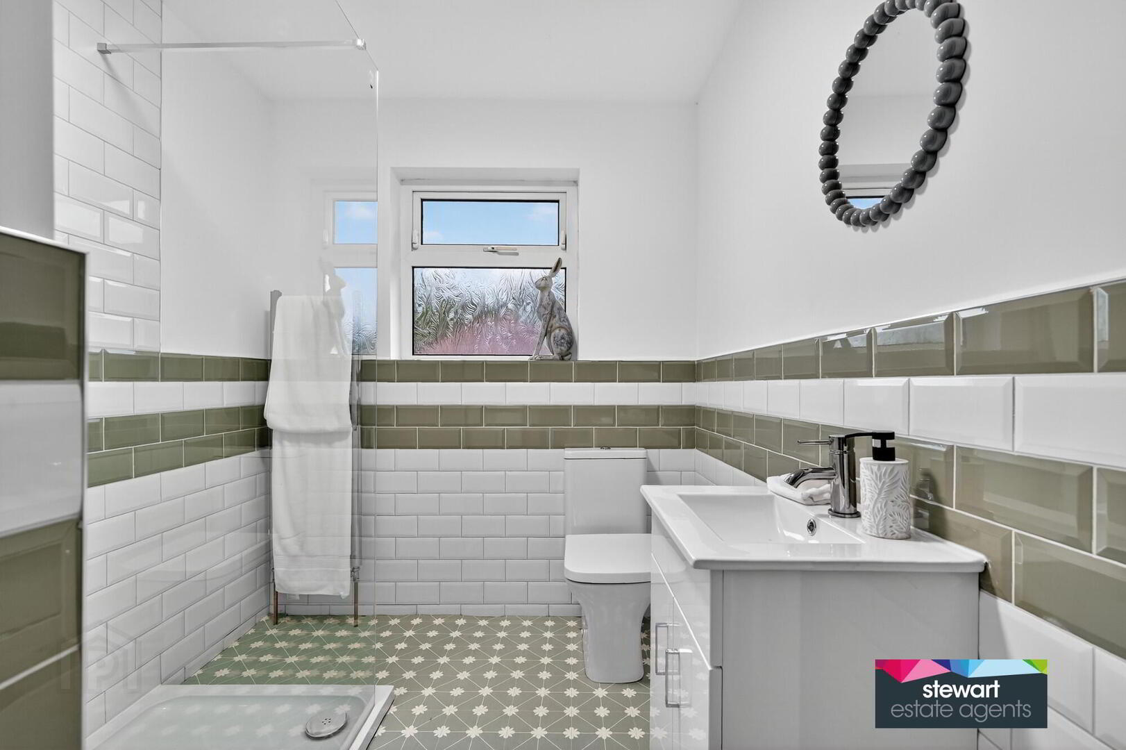 Newly renovated shower room with a walk in shower area with shower screen, WC and vanity wash hand basin. Stylish tiling. Fitted towel rail