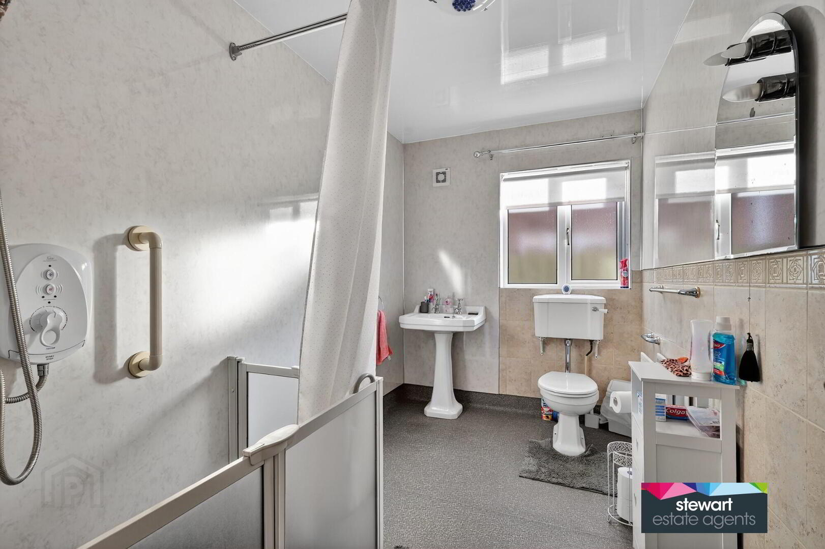 Bathroom with walk in shower area, WC and wash hand basin. Part panelled walls