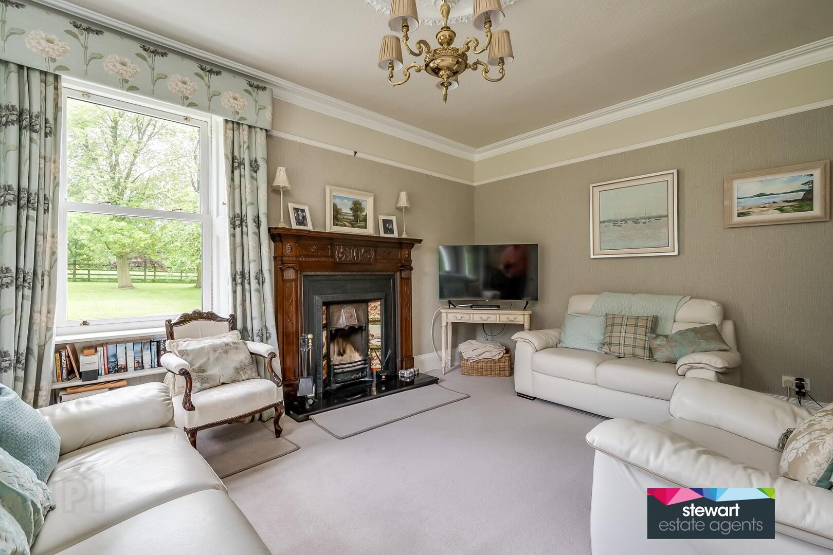 An elegant living room with bay window and a period style fireplace