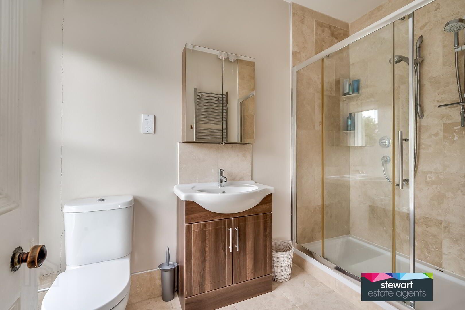 Stunning modern style bathroom with a free standing bath WC and cabinetry style vanity wash hand basin. Walk in shower area with shower fitment. Feature tiled walls and tiled floor