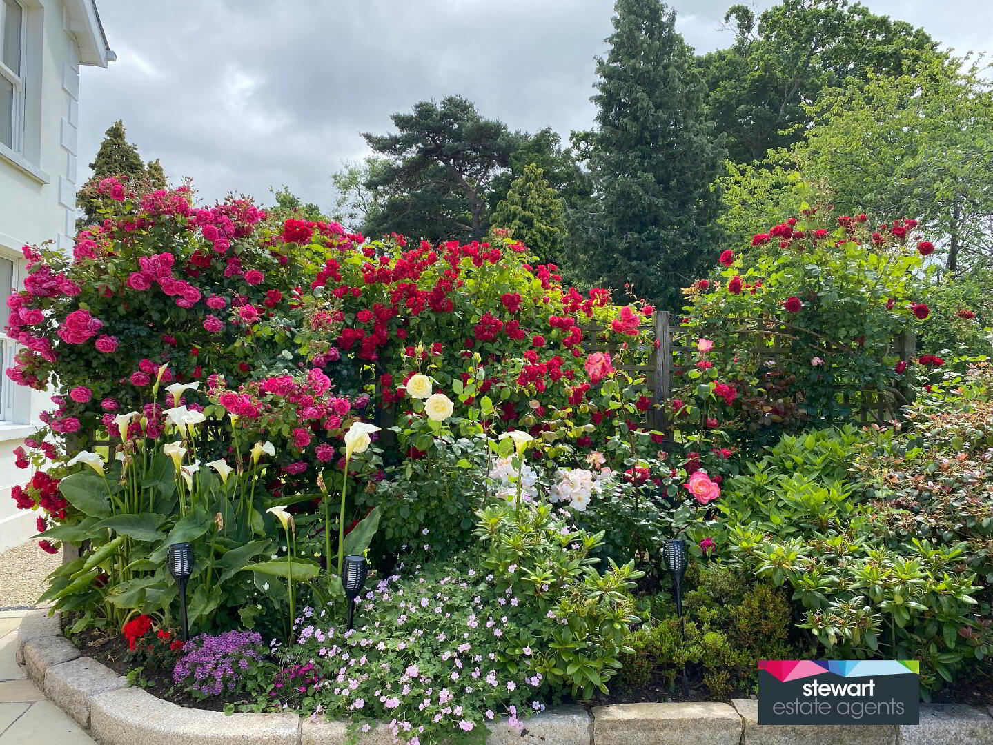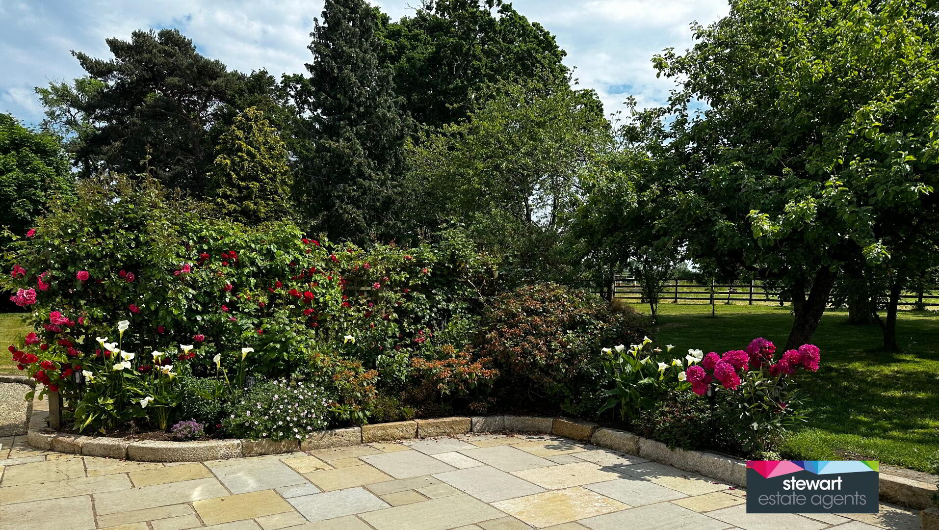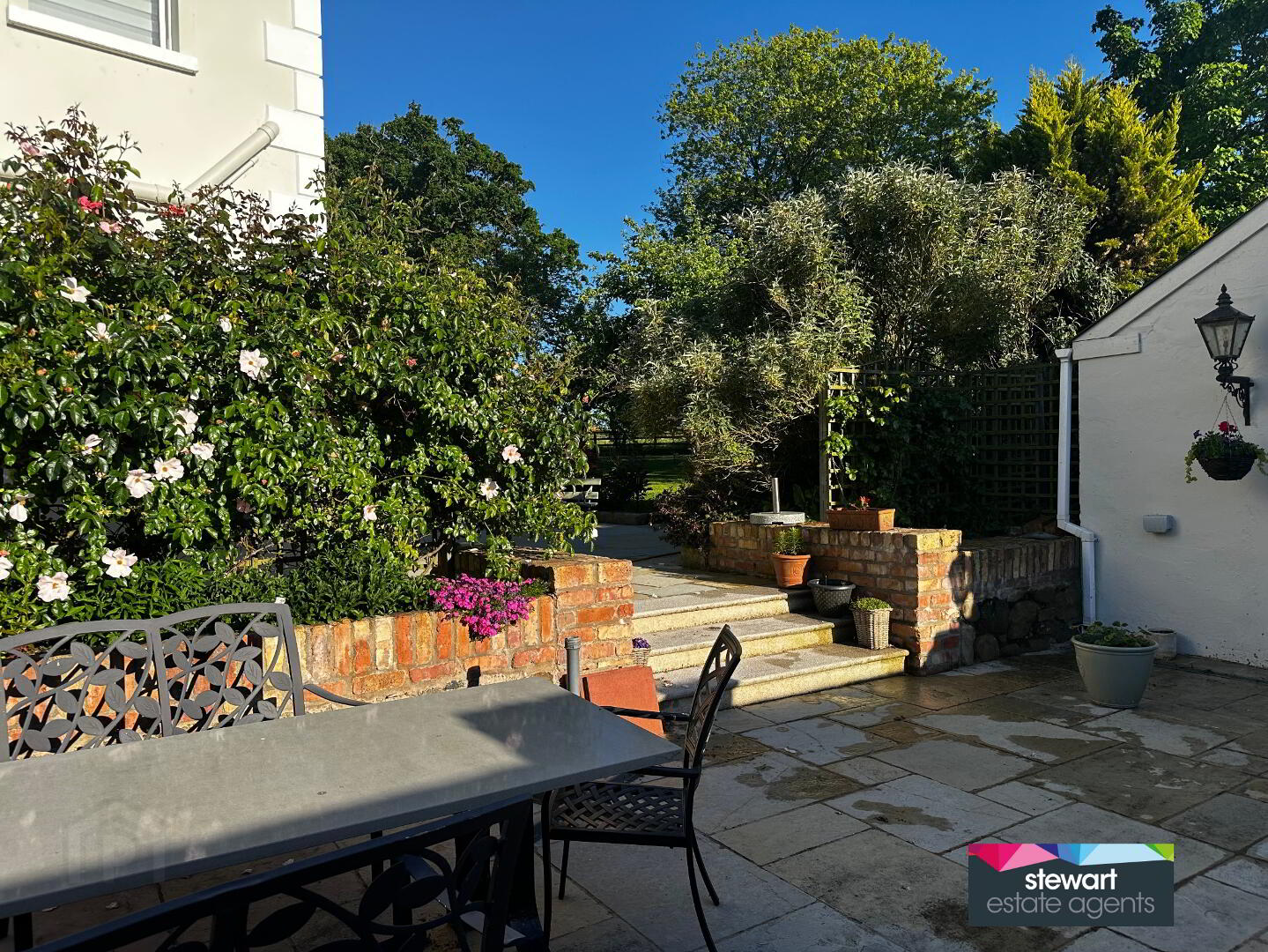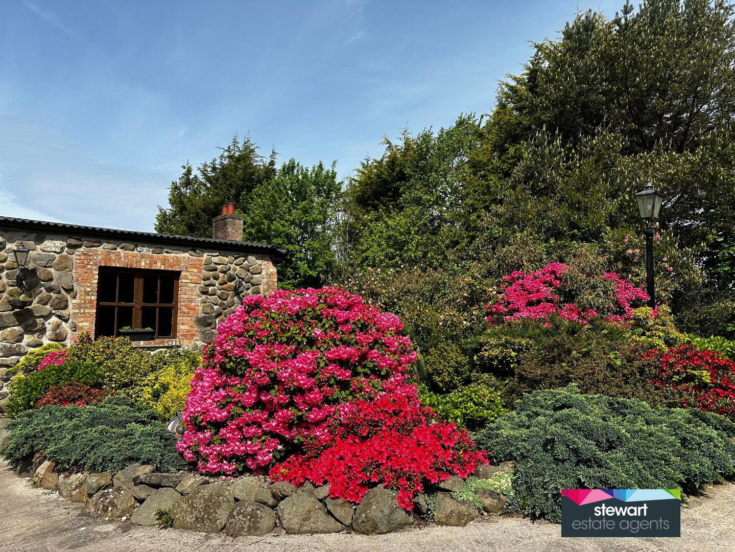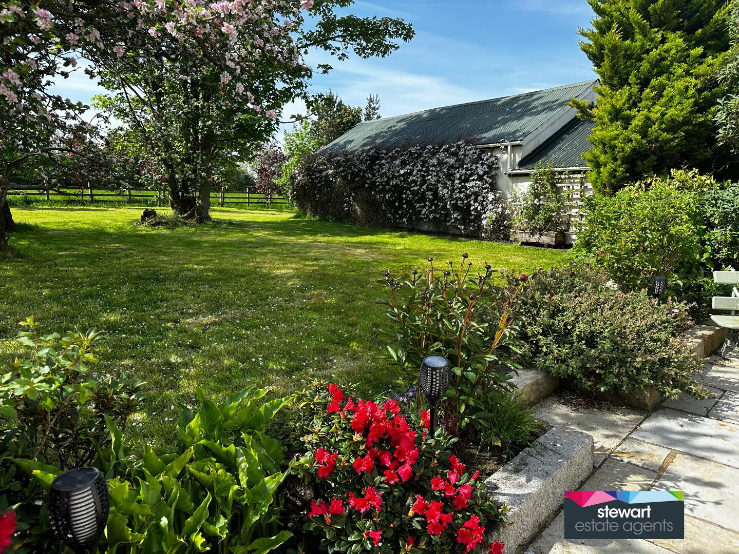Stunning gardens with a babbling brook and stone feature, an array of mature evergreen and deciduous trees as well as fruit trees, buxus hedging, floral borders and coach lights