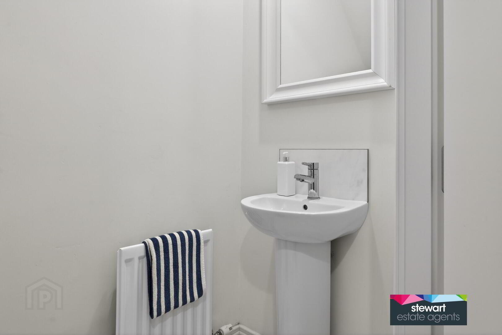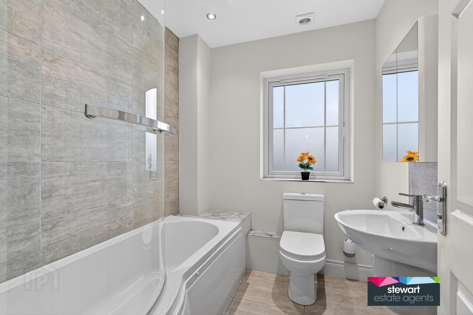 Bathroom on the first floor with a modern suite including a bath, WC and wash hand basin, shower fitment over bath with a glass shower screen