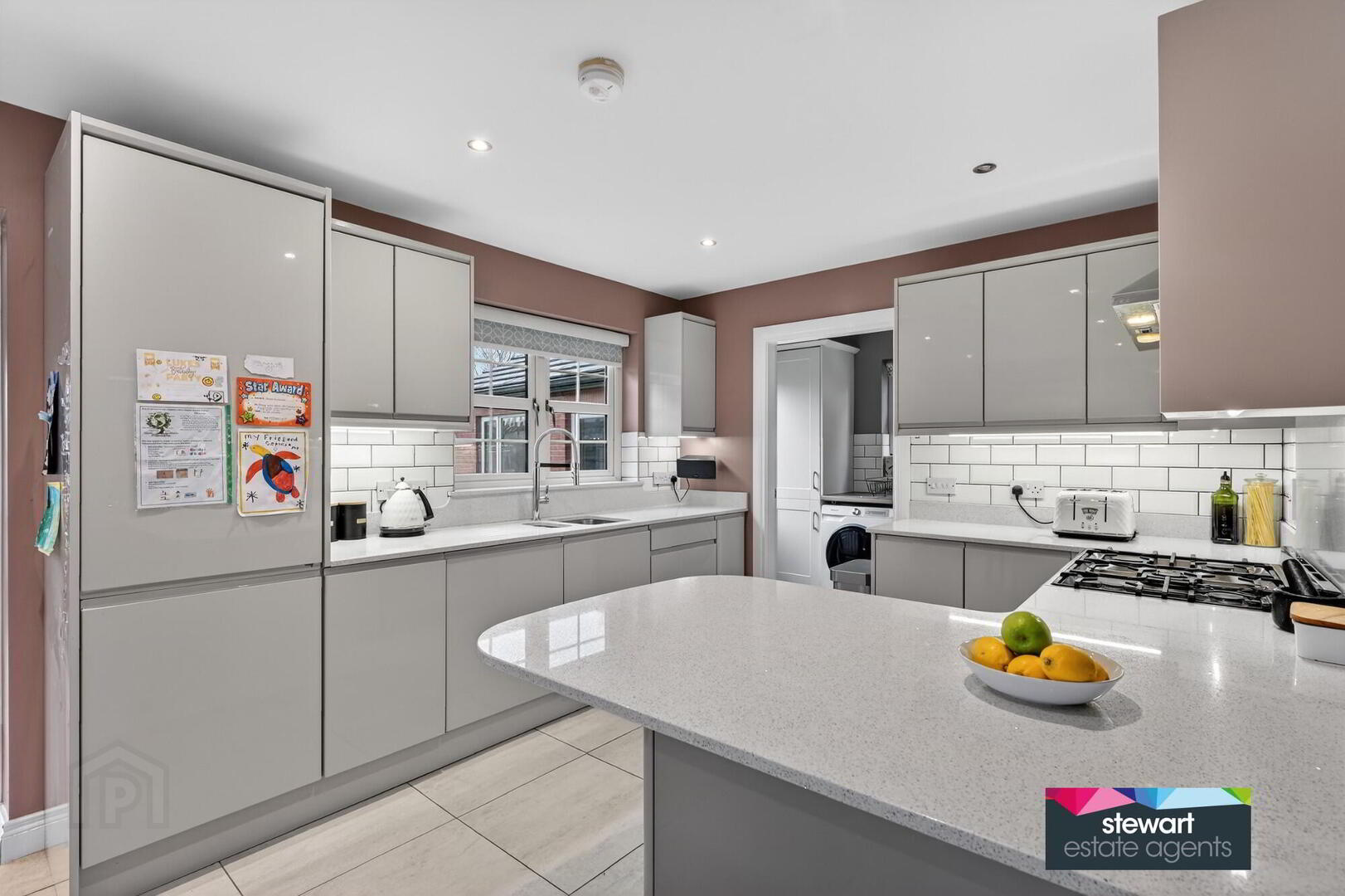 Contemporary style kitchen with a generous range of fitted high and low cabinetry including a built in fridge/freezer, integrated dishwasher, built in oven and inset gas hob