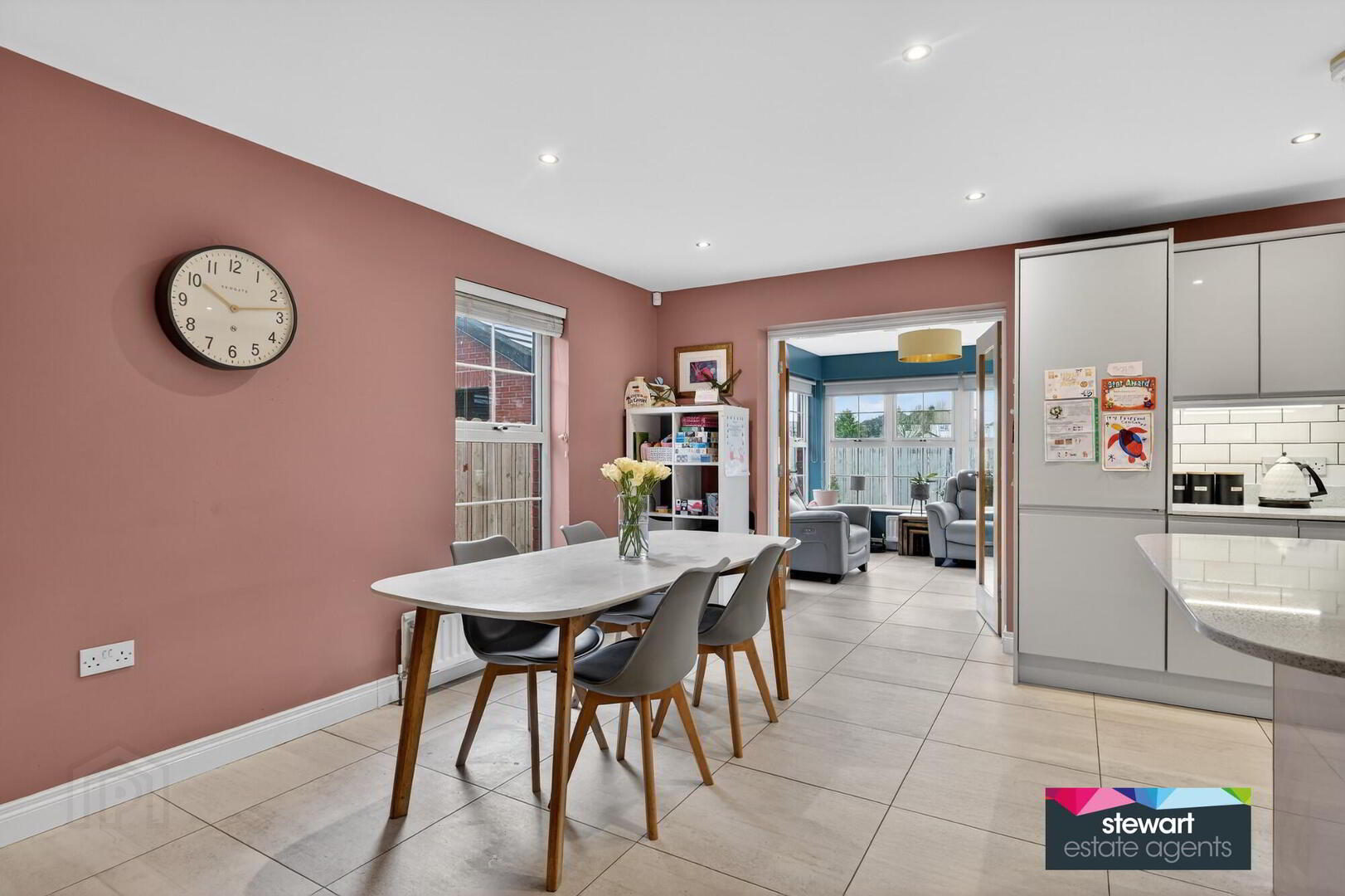 Open plan live in style kitchen with dining and family areas, with double doors leading into the sun room at the rear