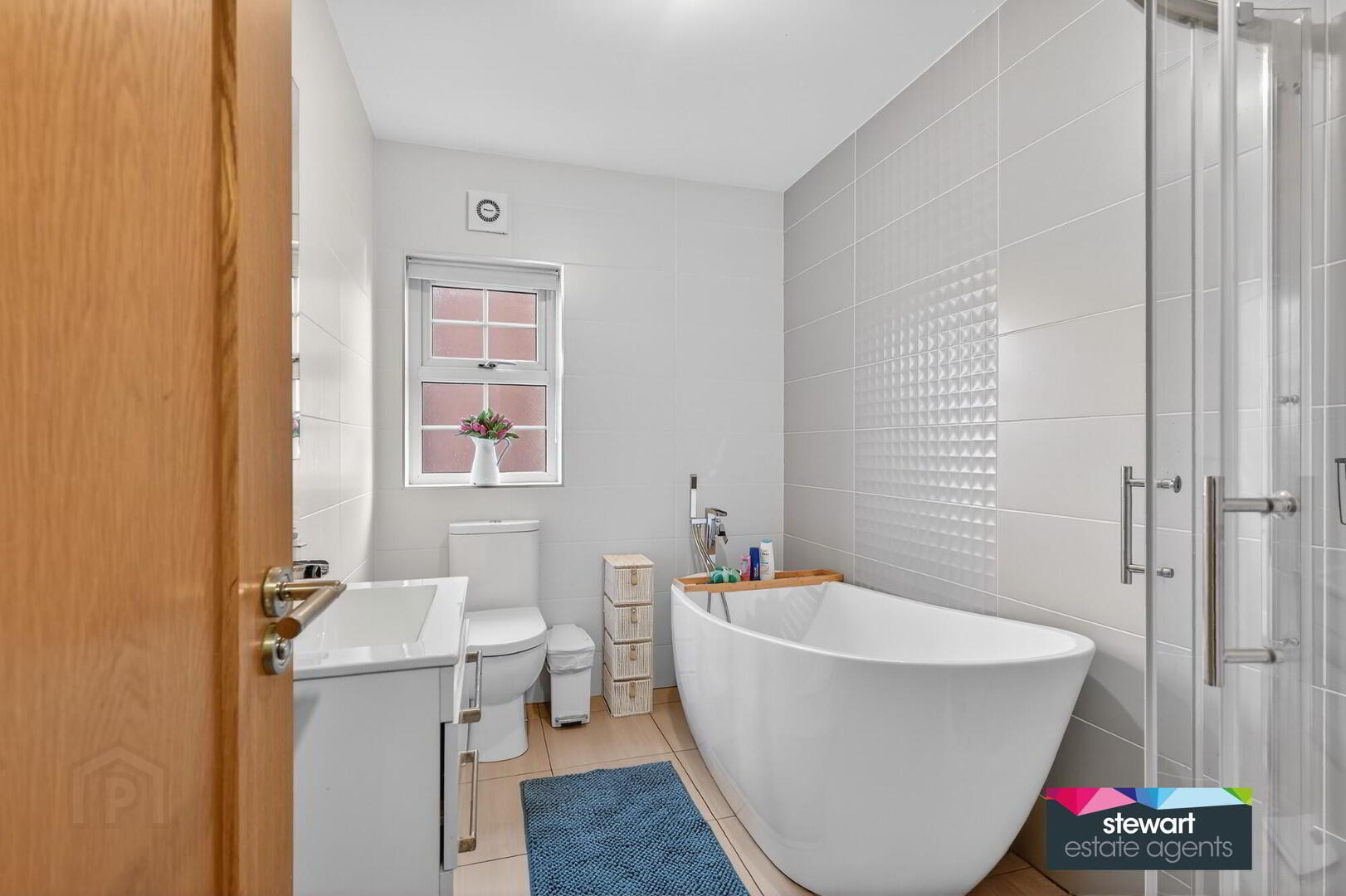 Bathroom on the first floor having a contemporary style white suite including a free standing bath, WC and wash hand basin as well as a separate shower cubicle. Tiled walls with an attractive tile design
