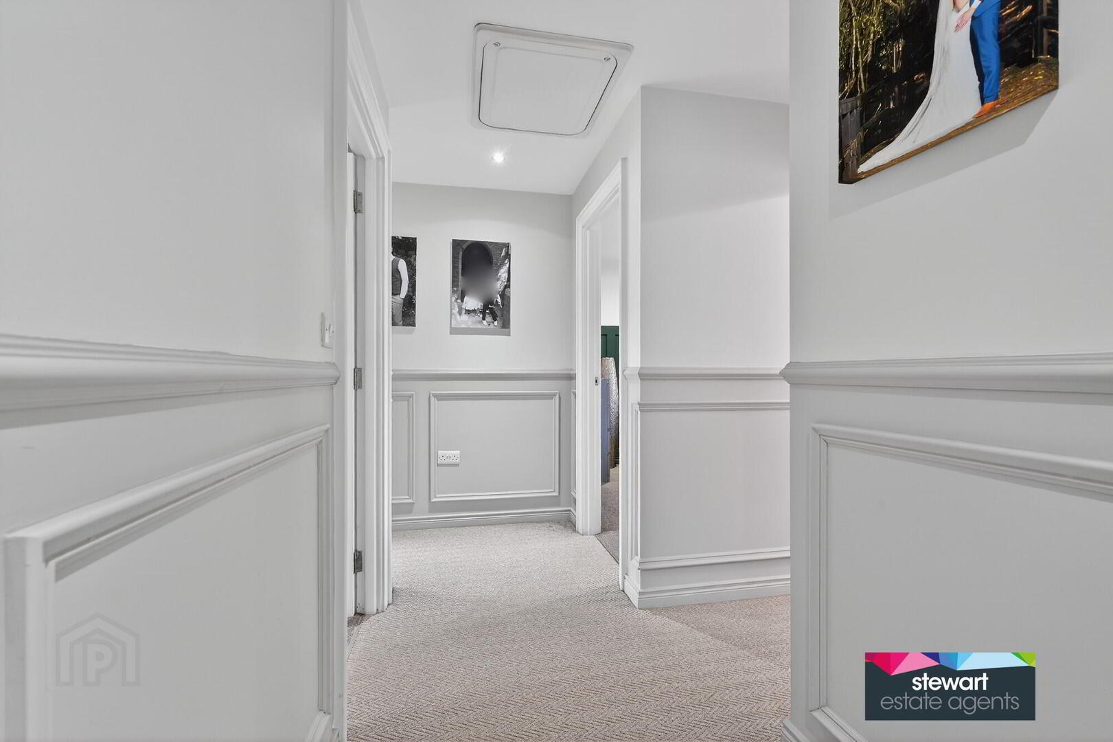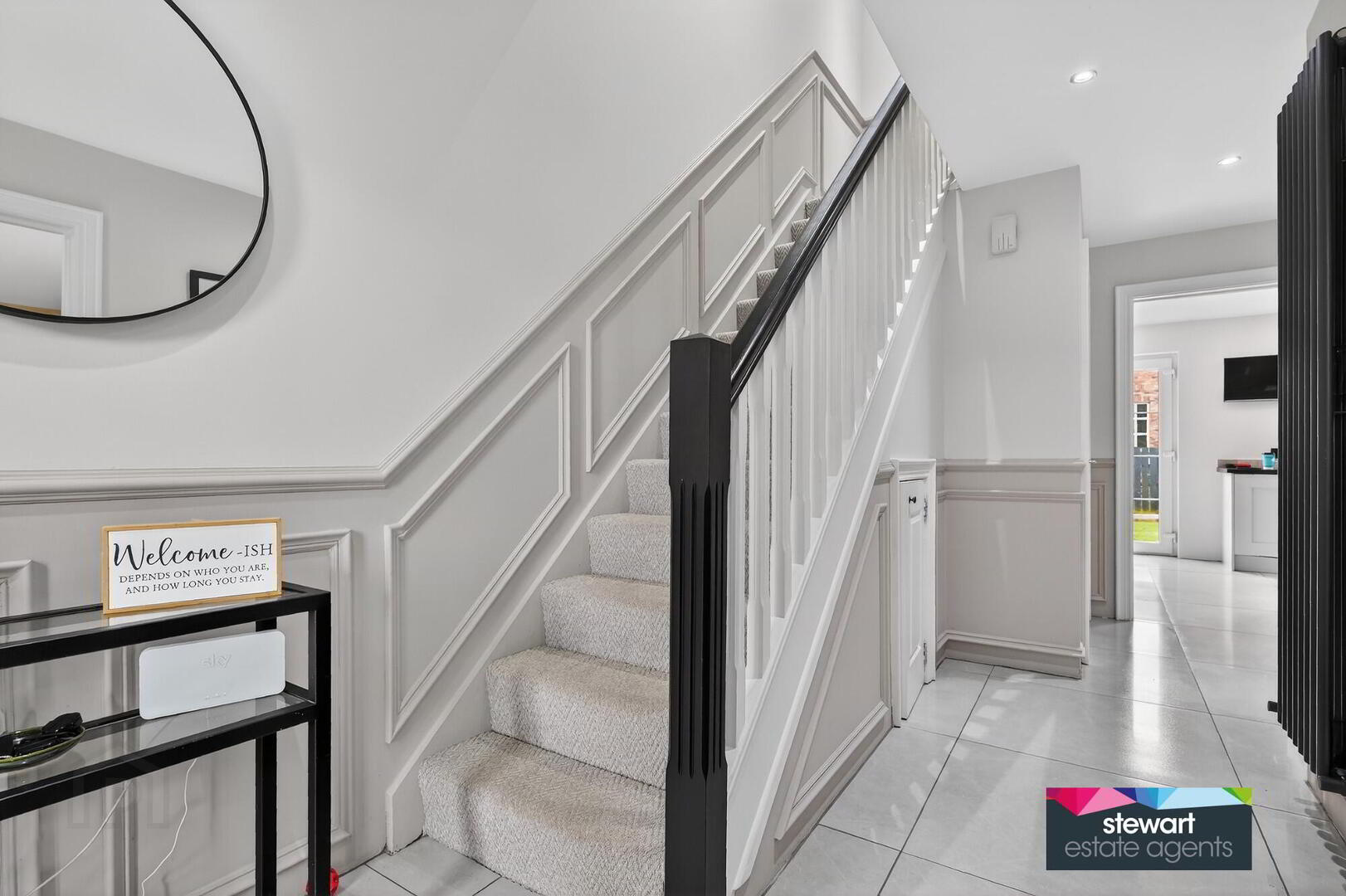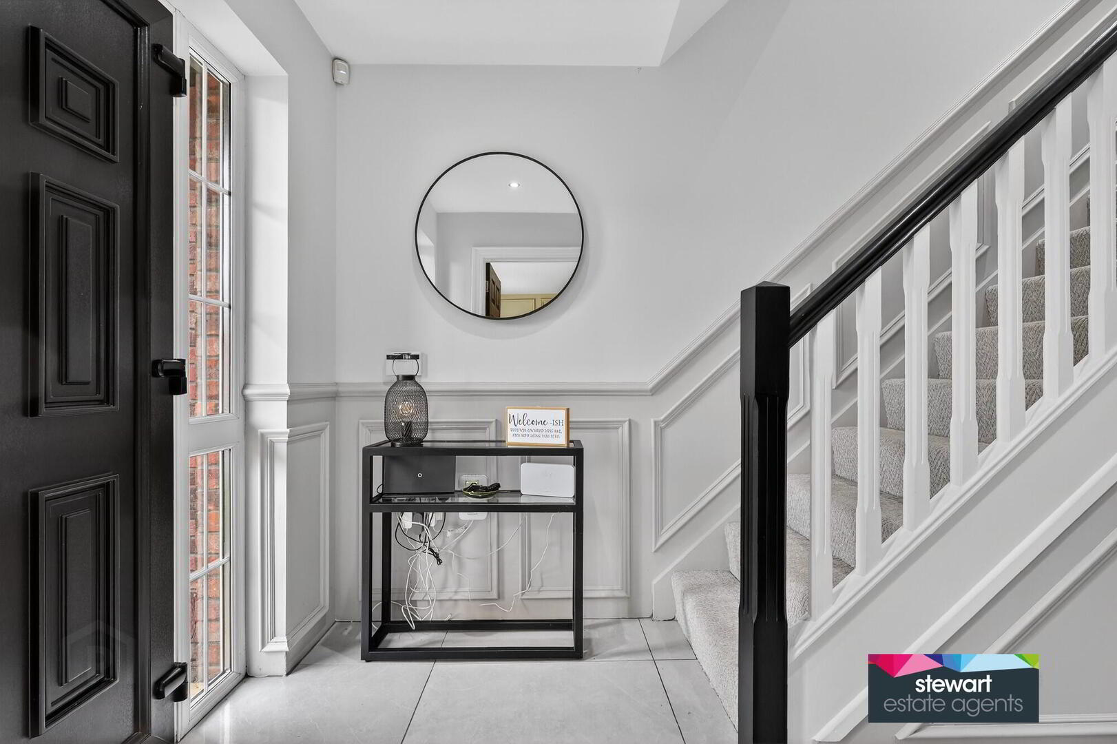 Elegant entrance hallway with an attractive PVC double glazed front door, feature panelled walls and a spindled staircase to the first floor accommodation