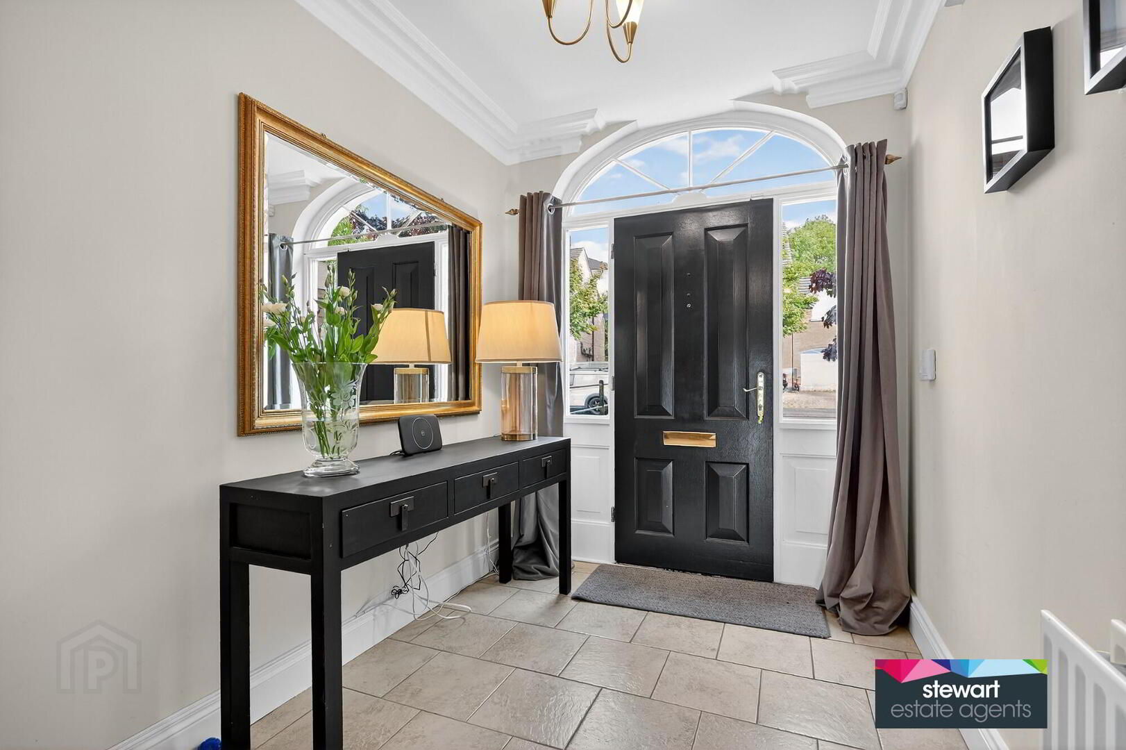 Elegant hallway with an attractive front door and feature fan light above. Spindled staircase to the first floor accommodation. Ceiling cornice and centre rose