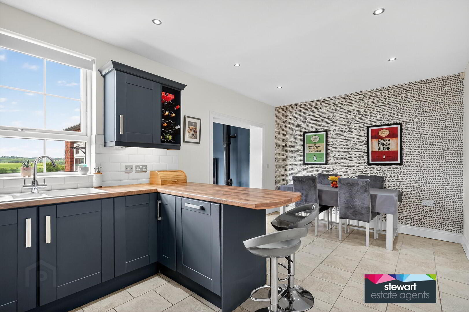 Practically designed kitchen cabinetry with ample high and low level storage including a built in oven, inset gas hob and extractor fan above. Integrated dish washer