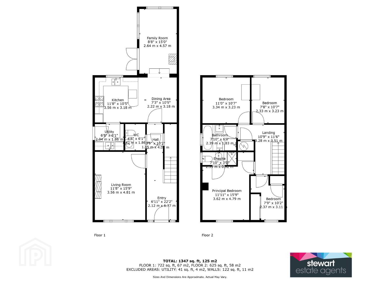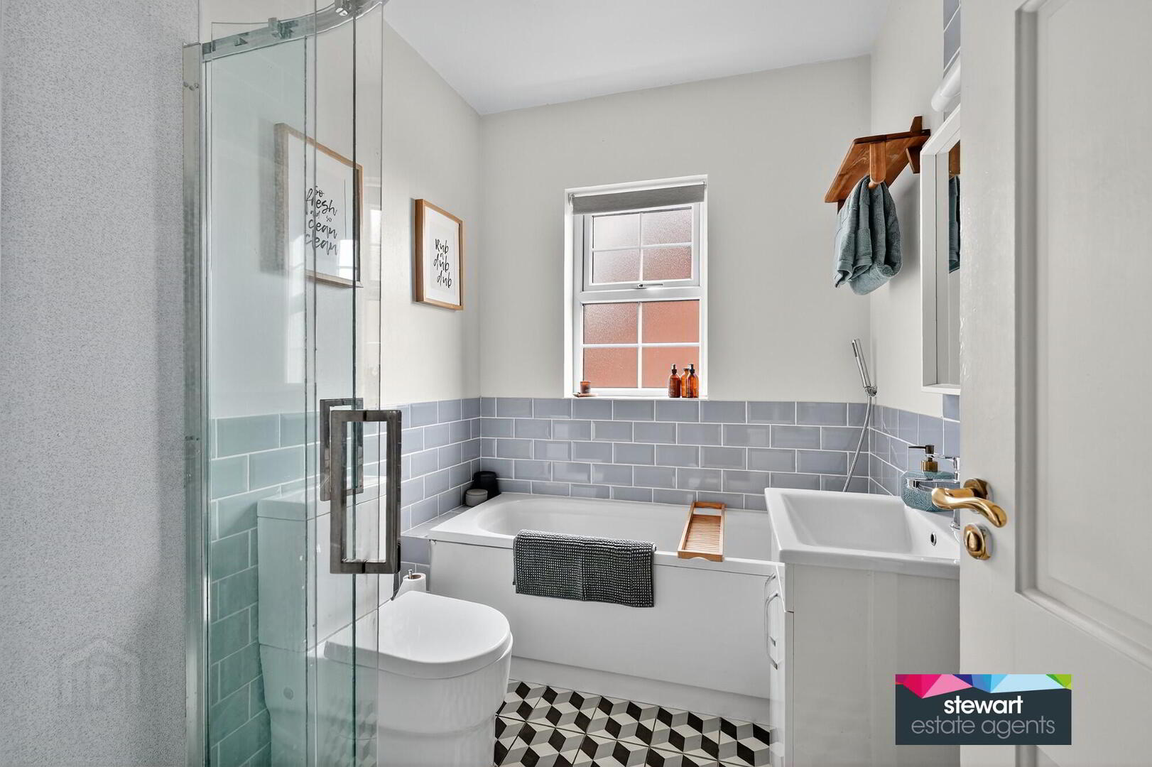 Bathroom on the first floor with a white suite including a bath, WC and wash hand basin. Separate shower cubicle