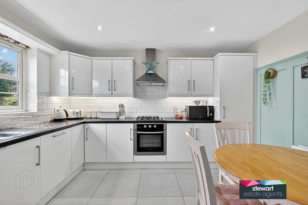 Contemporary style fitted kitchen with a good range storage cabinetry as well as a built in oven, gas hob and extractor fan, built in fridge/freezer and an integrated dishwasher
