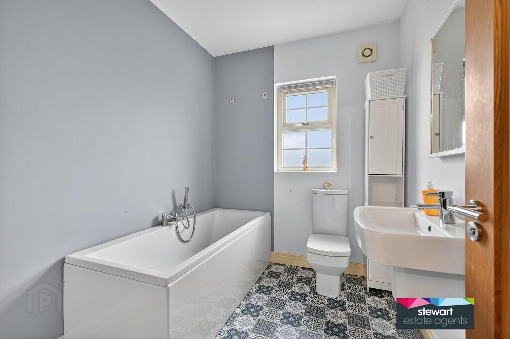 Bathroom on the first floor with a contemporary white suite including a bath, WC and wash hand basin