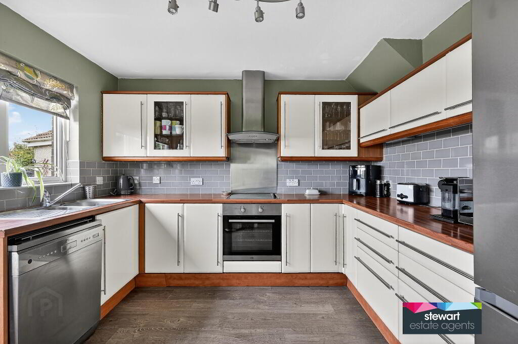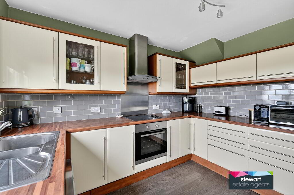 Kitchen with generous range of fitted kitchen cabinetry and has a built in oven, hob and extractor fan above