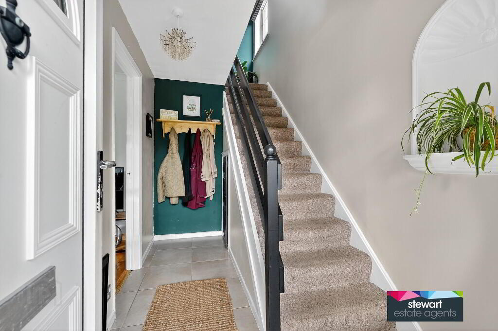 Very inviting hallway with stairs to the first floor accommodation, cloak area under stairs and a feature architectural wall niche