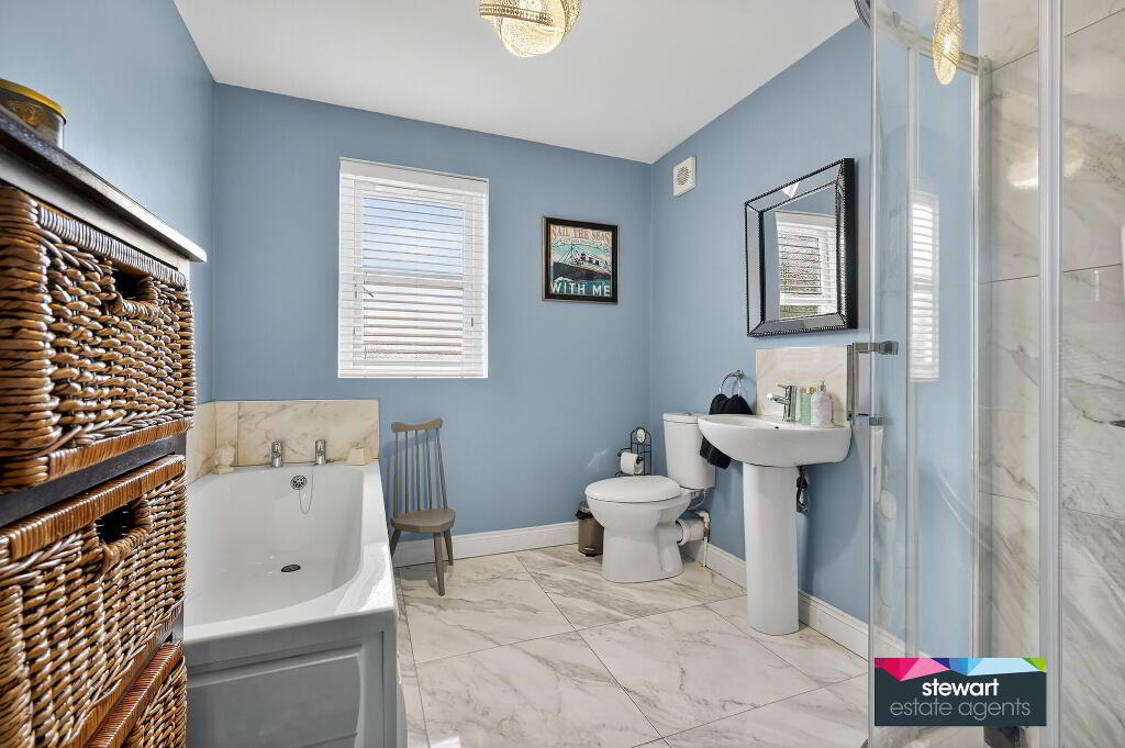 Bathroom on the first floor with a modern white suite including a bath, WC and wash hand basin, shower cubicle with shower fitment