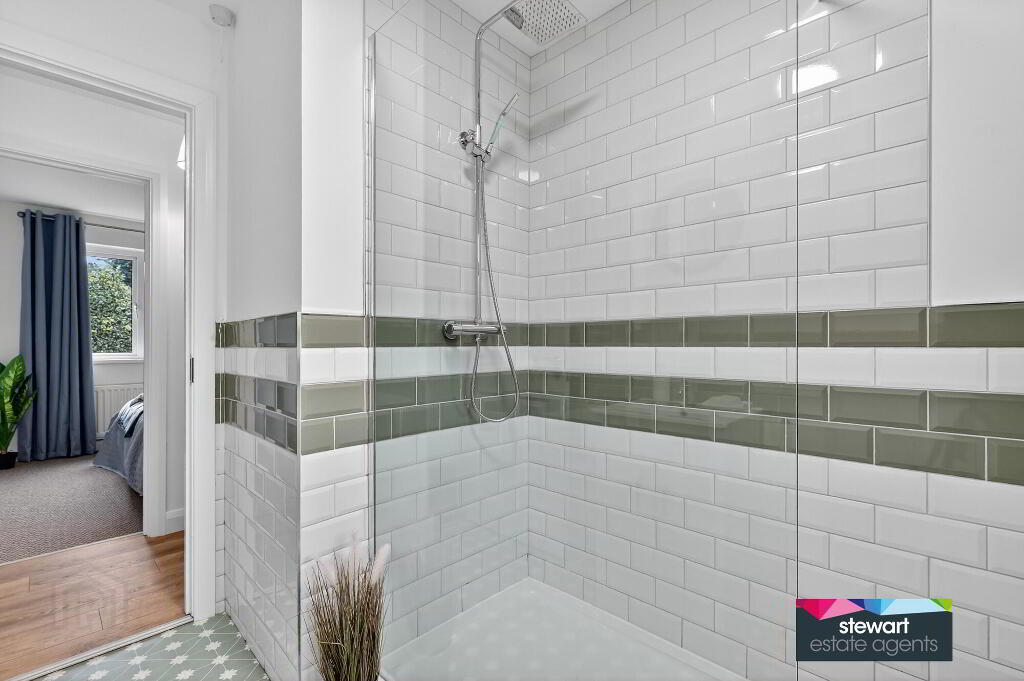 Newly renovated shower room with a walk in shower area with shower screen, WC and vanity wash hand basin. Stylish tiling. Fitted towel rail