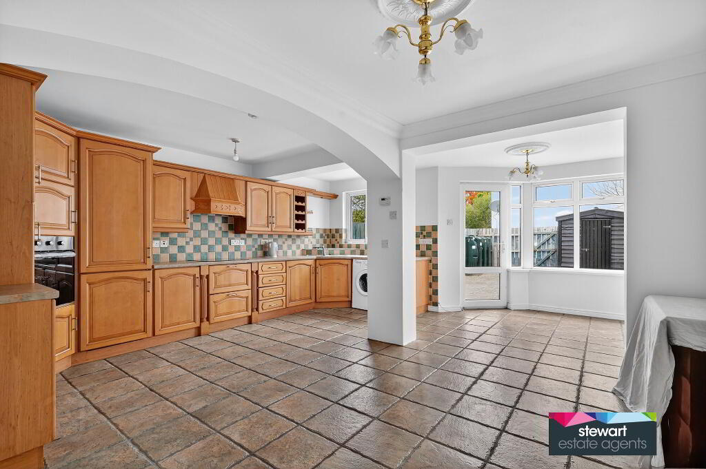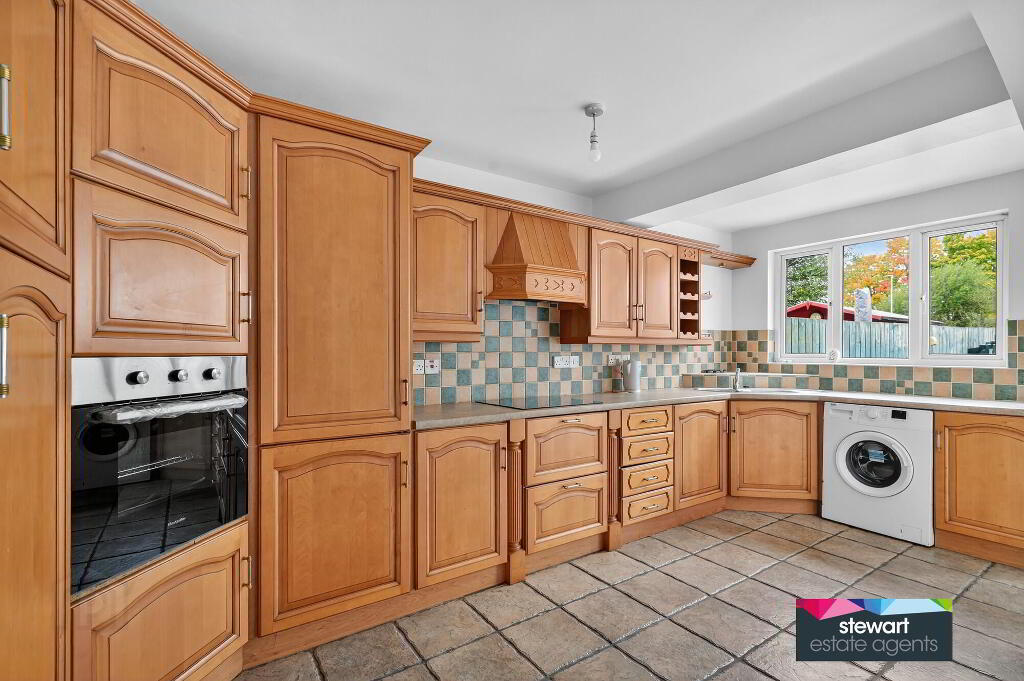 Beautifully fitted kitchen cabinetry with a generous range of high and low level units, built in oven inset hob with extractor fan above, built in fridge/freezer, space for an automatic washing machine. Tiled floor. PVC double glazed door to the rear garden