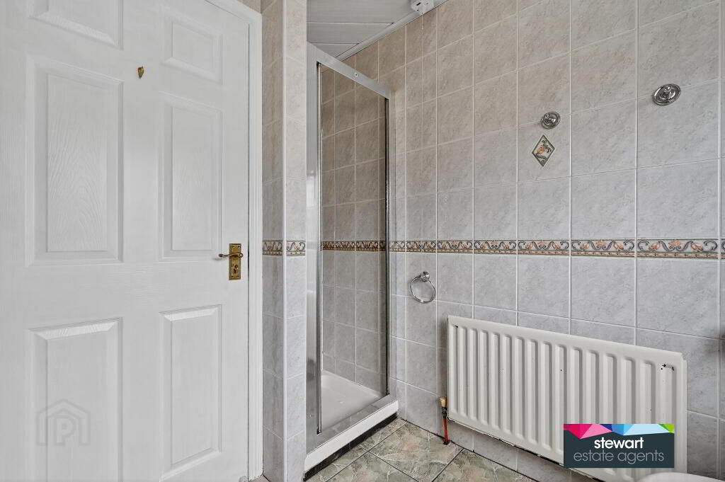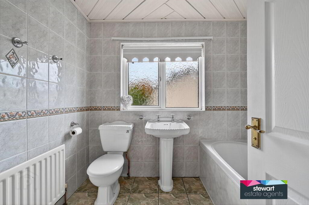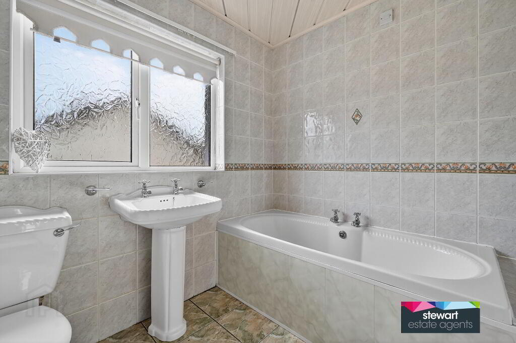 Fully tiled bathroom on the first floor with a bath, WC and wash hand basin. Inset shower cubicle