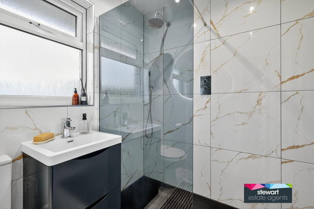 Newly fitted shower room with a walk in shower cubicle, WC and vanity wash hand basin. Fully tiled walls with feature wall tiles