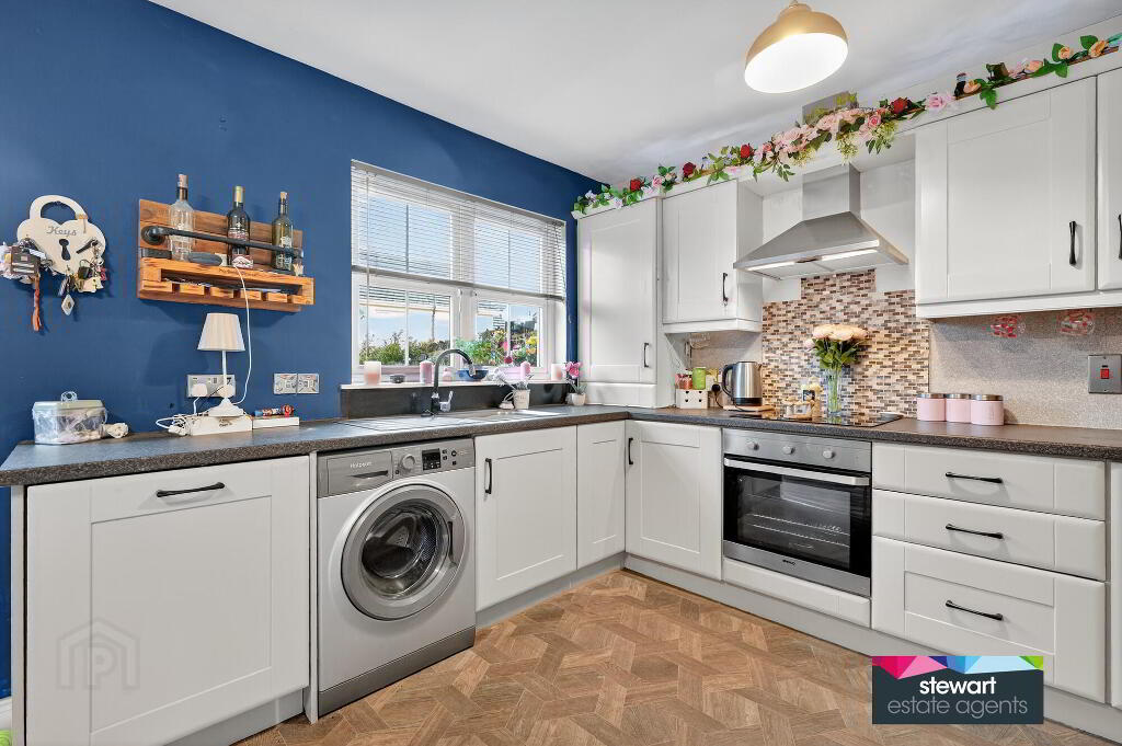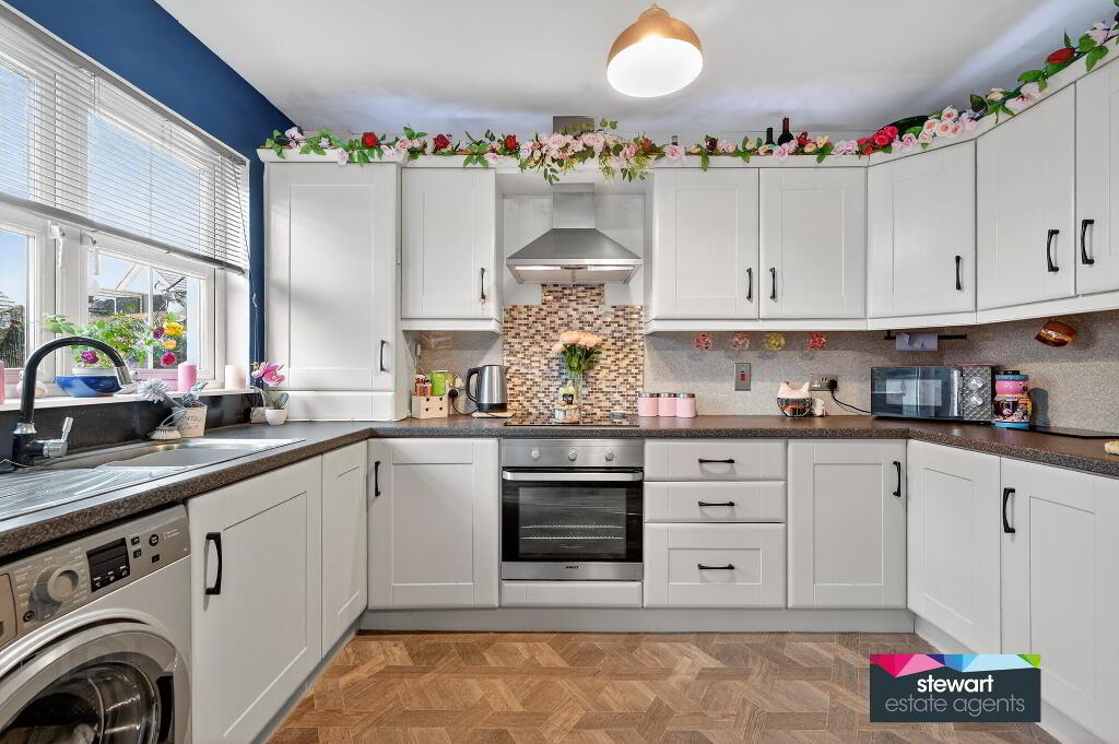 Contemporary style fitted kitchen cabinetry with a good range of fitted high and low level units with a built in oven and inset gas hob and extractor fan above. Space for a washing machine. PVC double glazed door to the rear garden