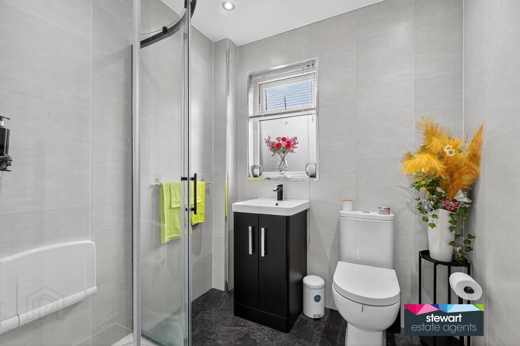 Contemporary style shower room on the first floor including a shower cubicle with fitted seat, vanity wash hand basin and WC. Feature panelled walls