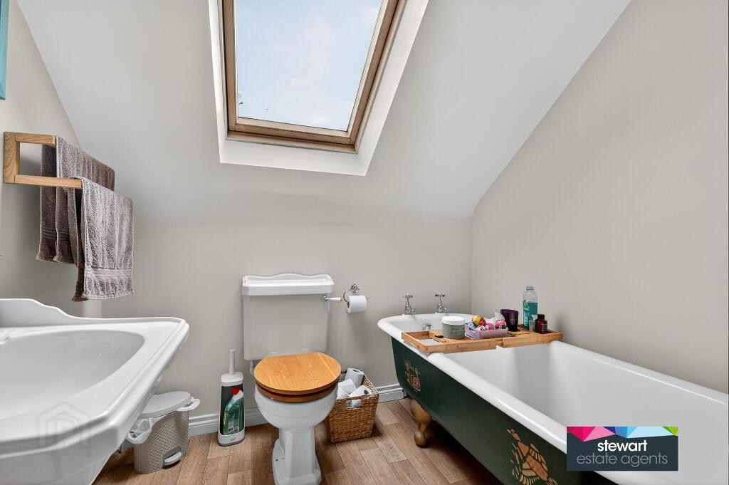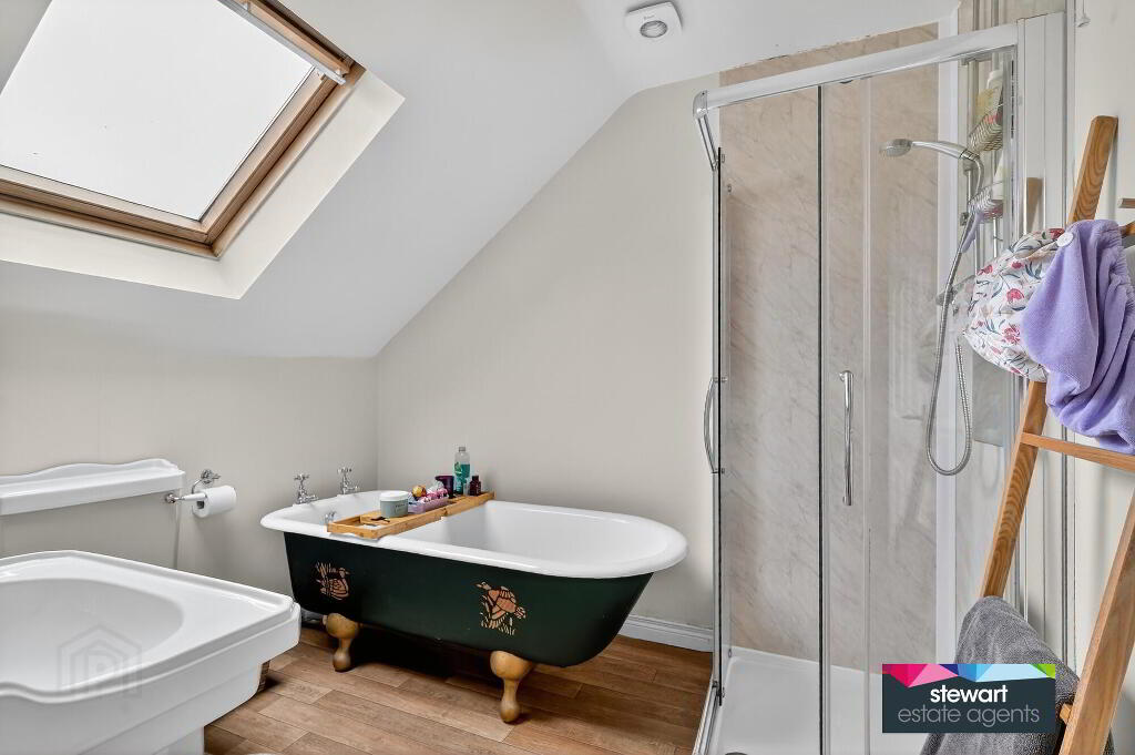 Bathroom on the first floor with a traditional style suite including a fee standing roll top bath, WC and wash hand basin. Separate shower cubicle with shower fitment