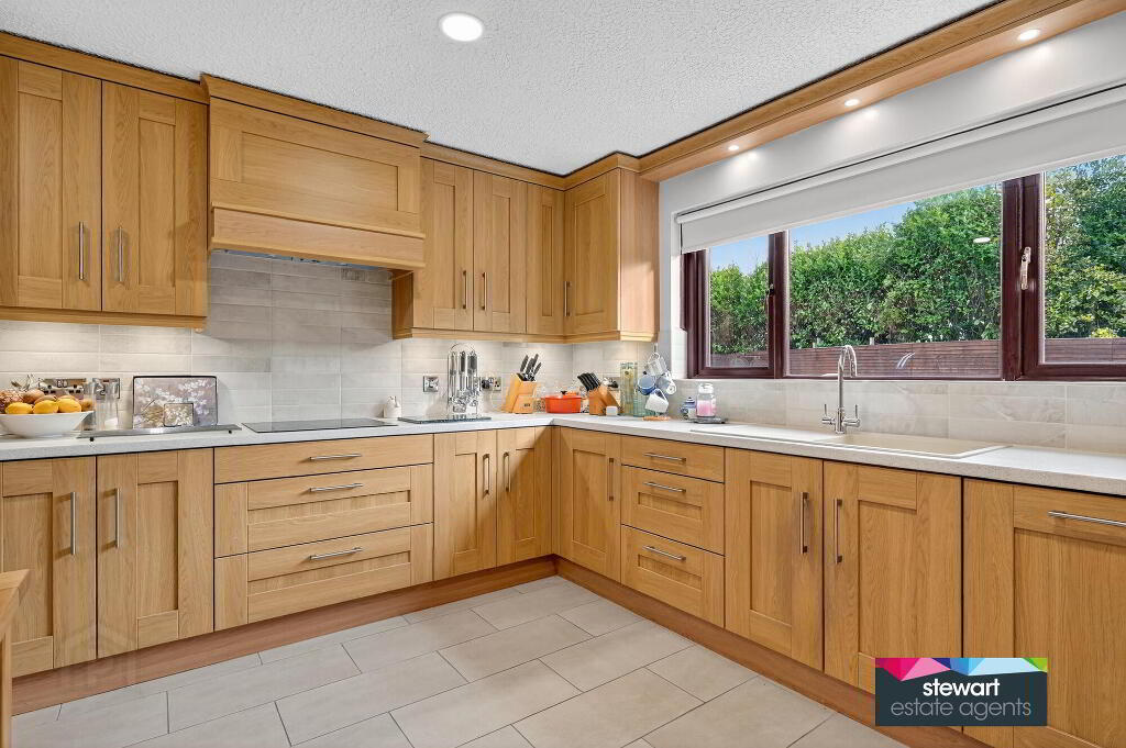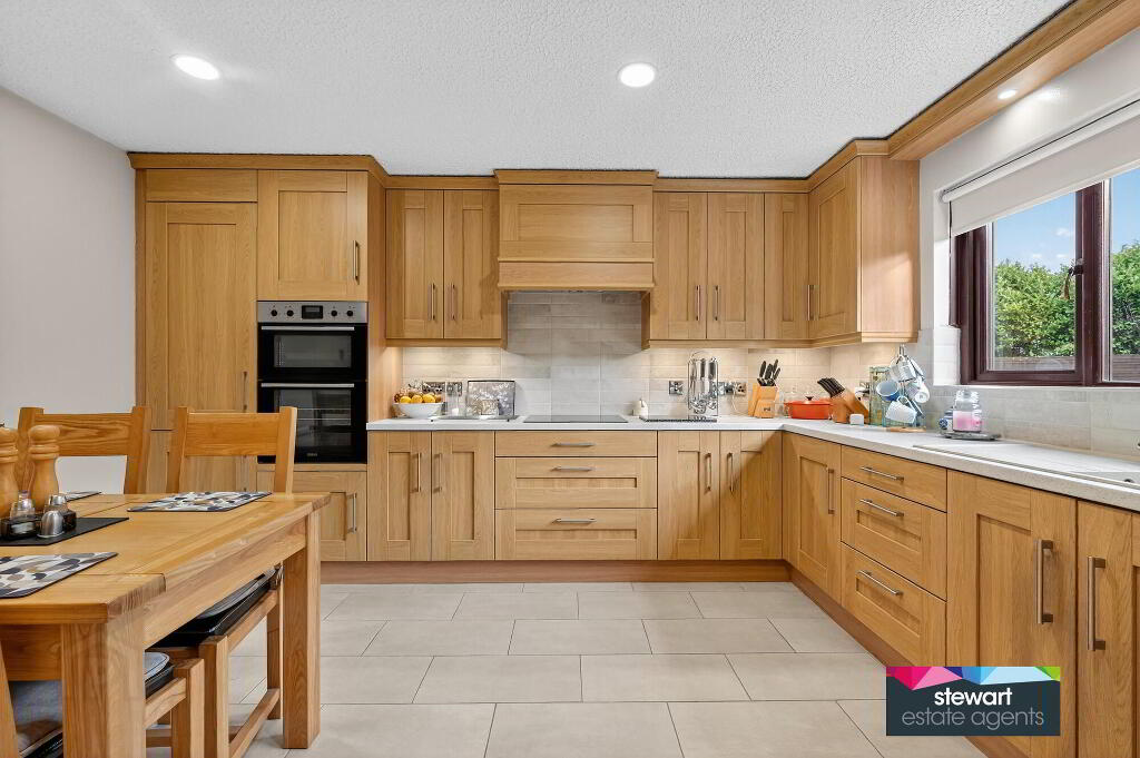 Spacious kitchen with dining area having a newly fitted bespoke fitted contemporary style range of high and low level units finished in a shaker style oak and including a built in double oven, inset hob with extractor fan above. Built in fridge/freezer, built in dish washer, attractive tiled floor