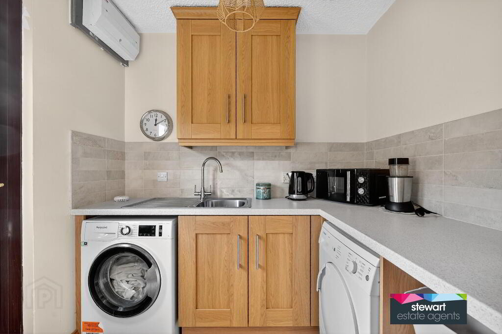Separate utility room with fitted units including a space for a washing machine and space for a tumble dryer. PVC double glazed rear door