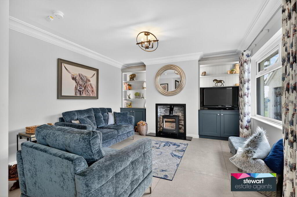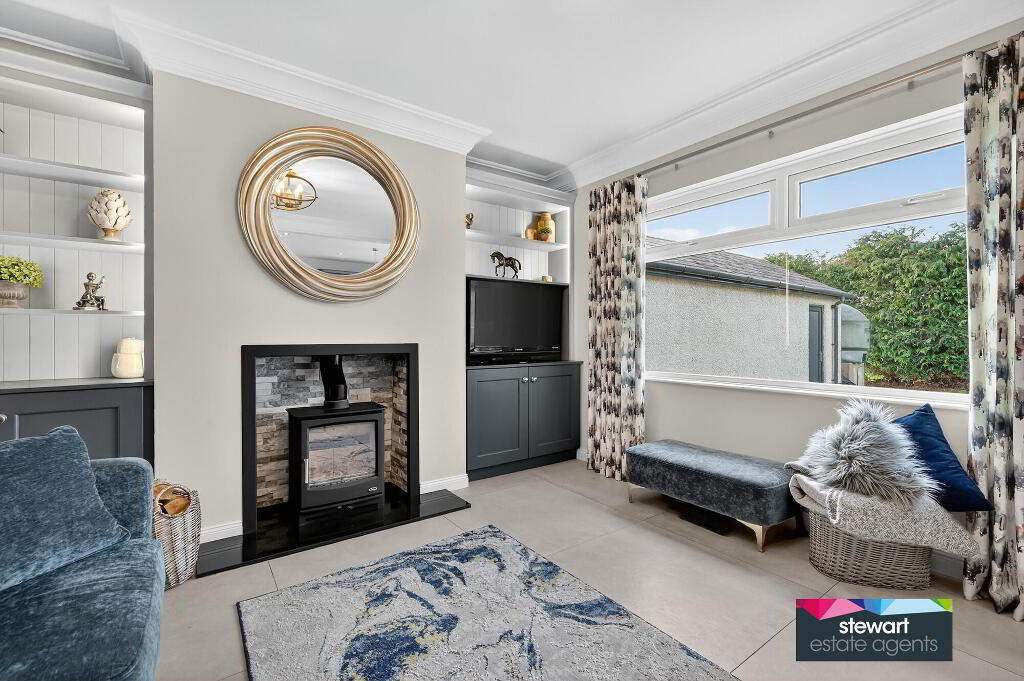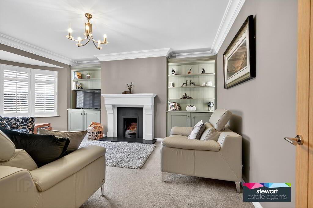 Living room with a bow window, impressive limestone fireplace and bespoke fitted cabinetry to each side of the fireplace with storage and shelving as well as concealed LED lighting. Plaster moulded Ceiling cornice