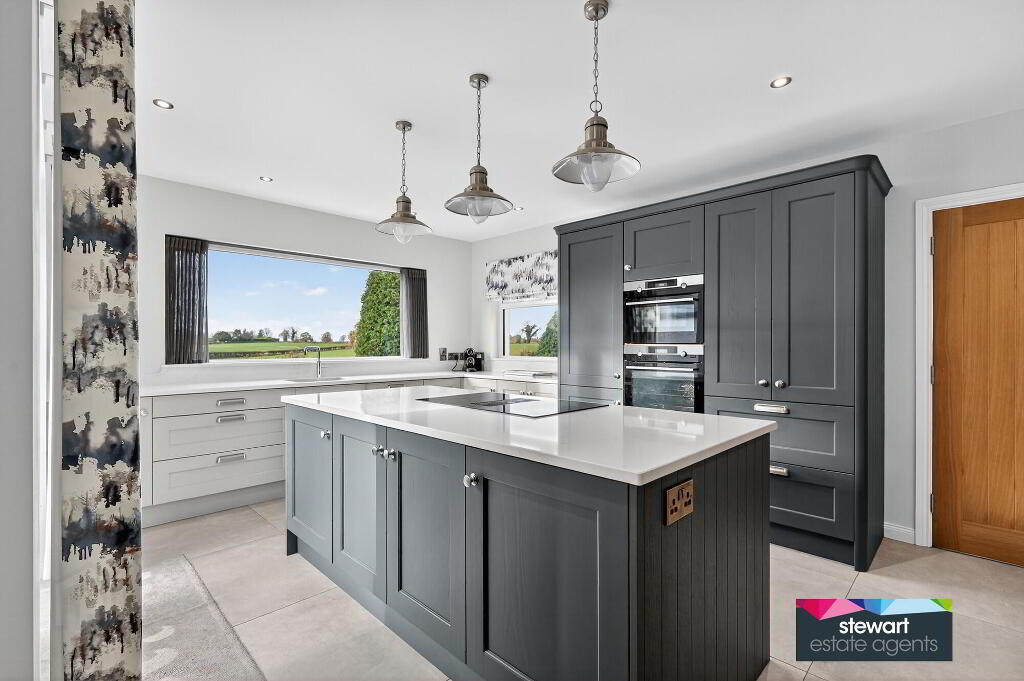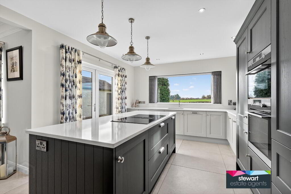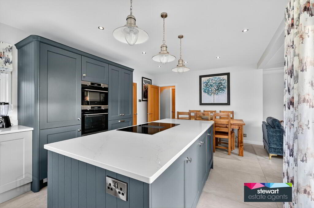 Kitchen/dining room with a beautifully designed bespoke two tone kitchen units with matching island unit incorporating an inset ceramic induction hob with integrated extractor fan. Bespoke fitted larder unit. Built in double ovens. Integrated dish washer. Quooker water tap