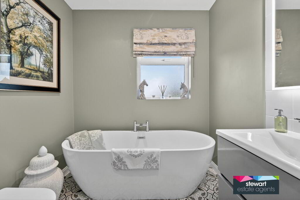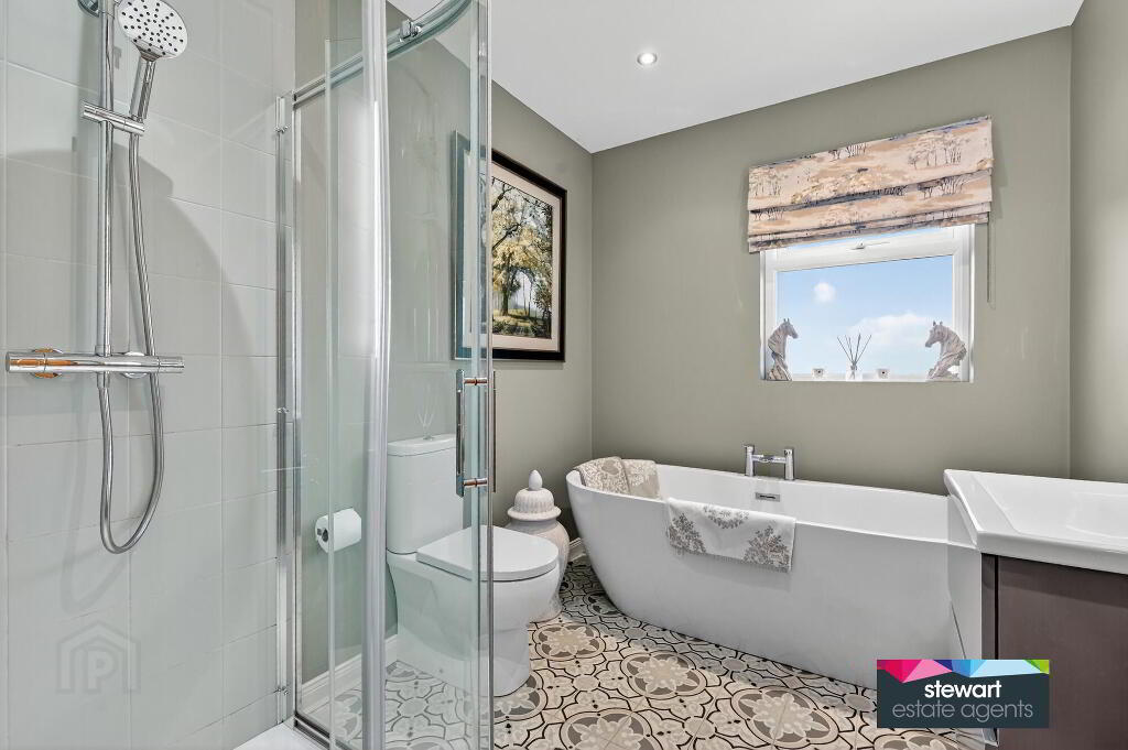 Beautifully appointed bathroom with a very stylish suite including a free standing bath, WC and pedestal wash hand basin. Shower cubicle with a thermostatically controlled shower fitment