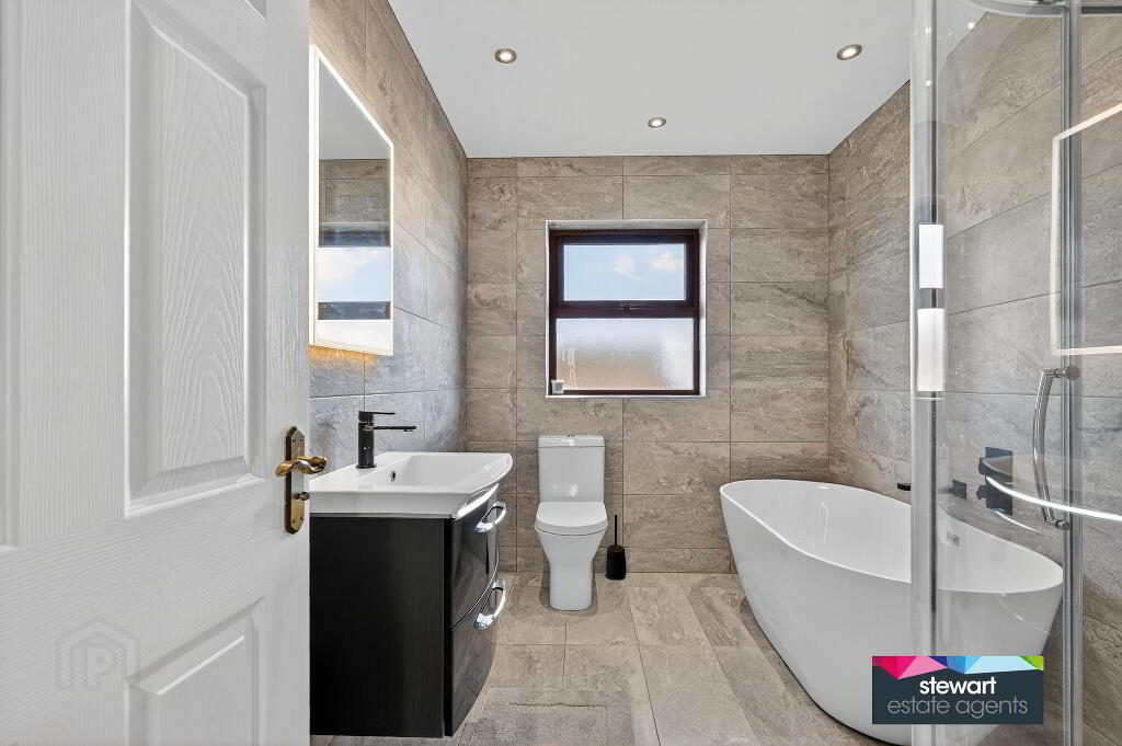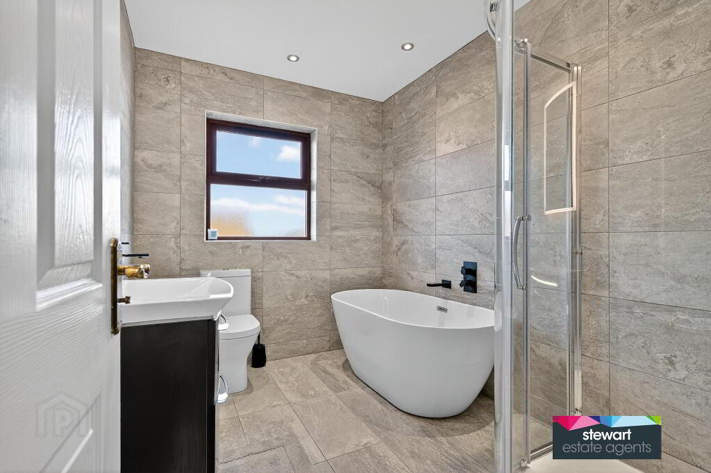 Bathroom with a contemporary style suite including a modern free standing bath, WC and wash hand basin. Separate shower cubicle. Feature tiled walls
