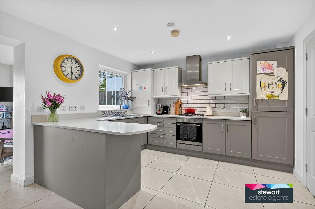 Contemporary style kitchen cabinetry with ample high and low level storage, built in fridge/freezer, integrated washing machine, integrated dish washer, built in oven and inset gas hob with extractor fan above
