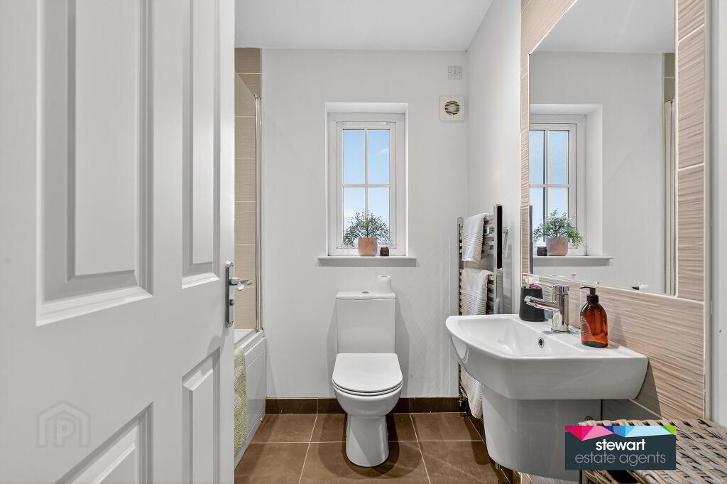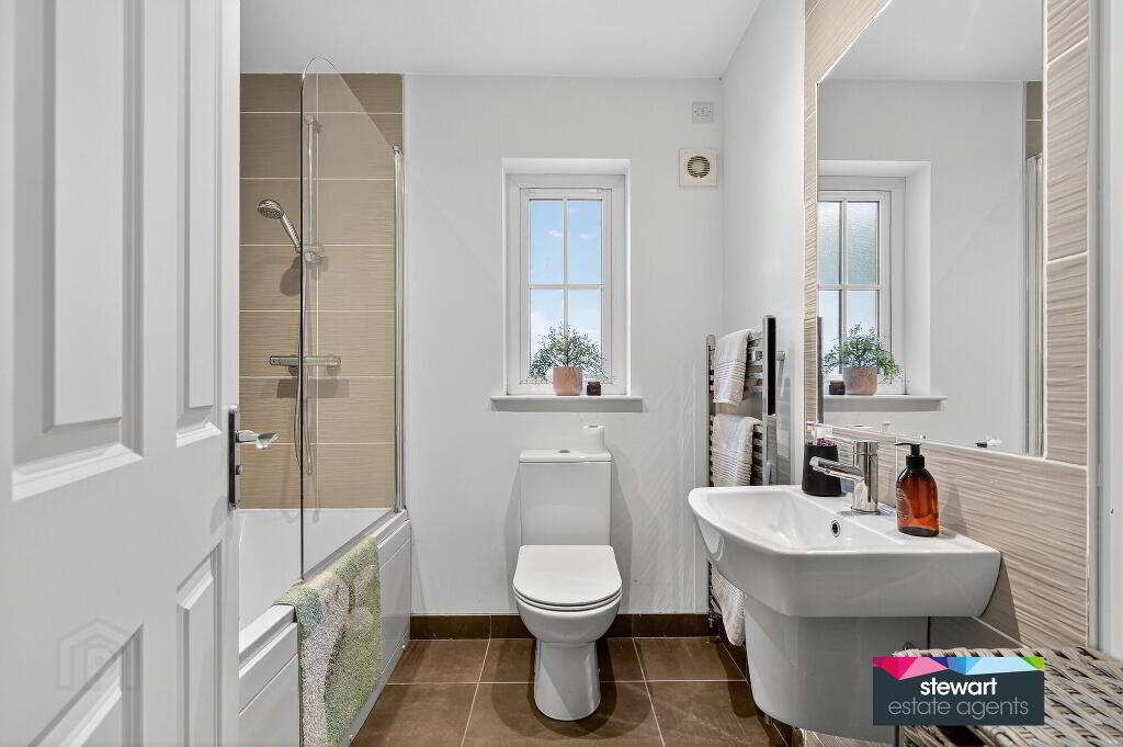 Bathroom on the first floor with bath, WC and wash hand basin. Shower fitment and glass shower screen over bath, partially tiled walls