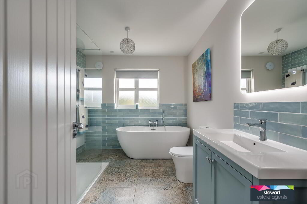 Contemporary style bathroom on the ground floor with a stylish suite including a free standing bath, WC and vanity wash hand basin. Glazed shower cubicle with shower fitment