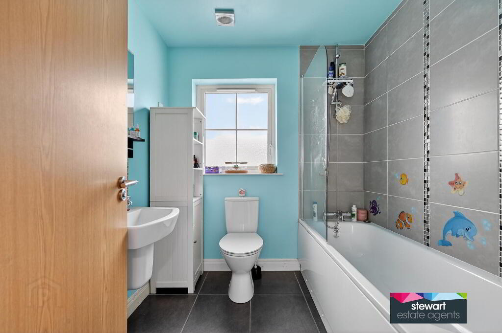 Bathroom on the first floor with a modern style suite including a bath, WC and wash hand basin. Shower fitment over bath with glass shower screen