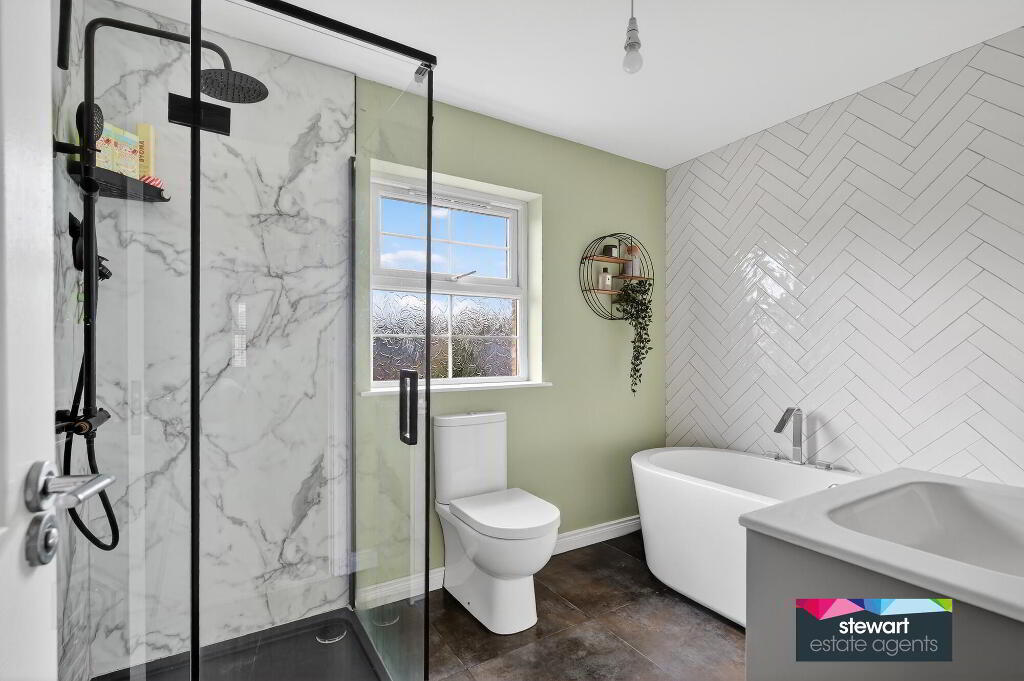 Bathroom on the first floor with a beautifully designed bathroom with a free standing bath, WC and wash hand basin. An attractive shower cubicle
